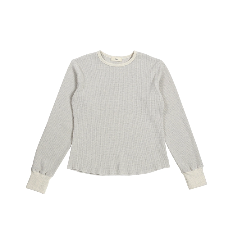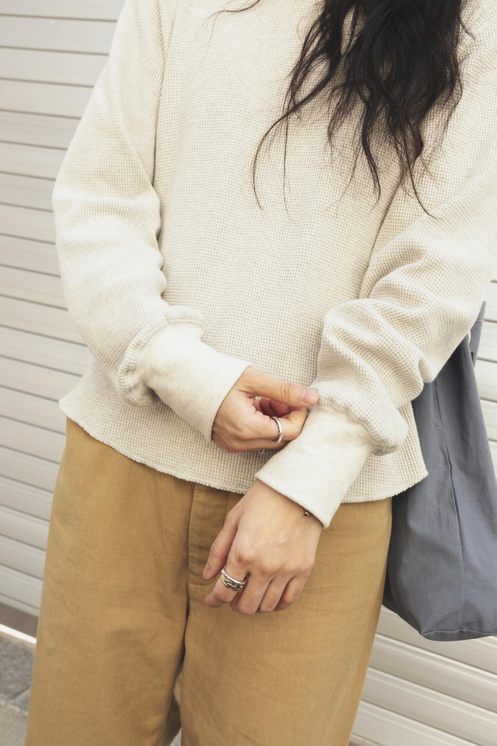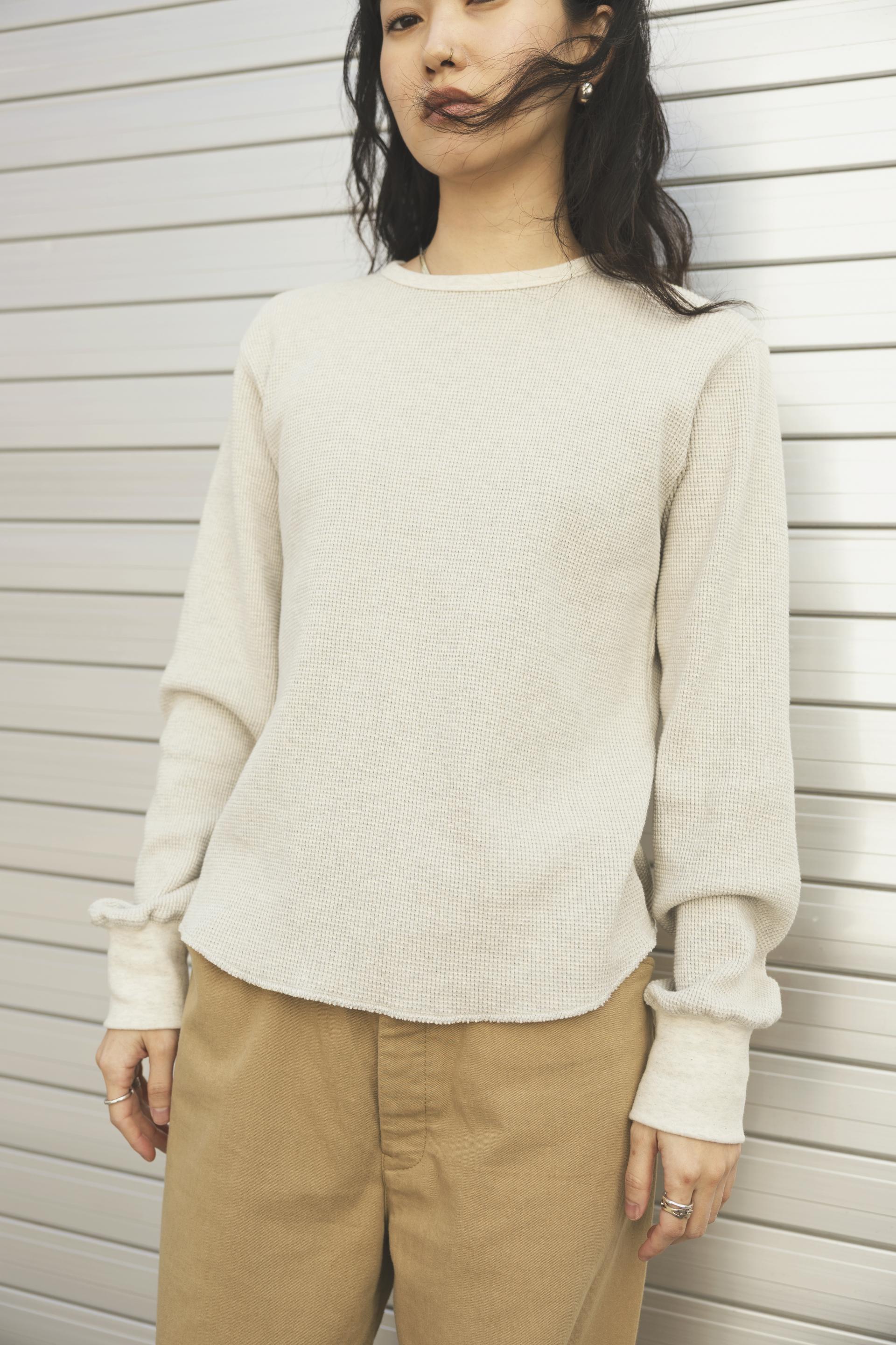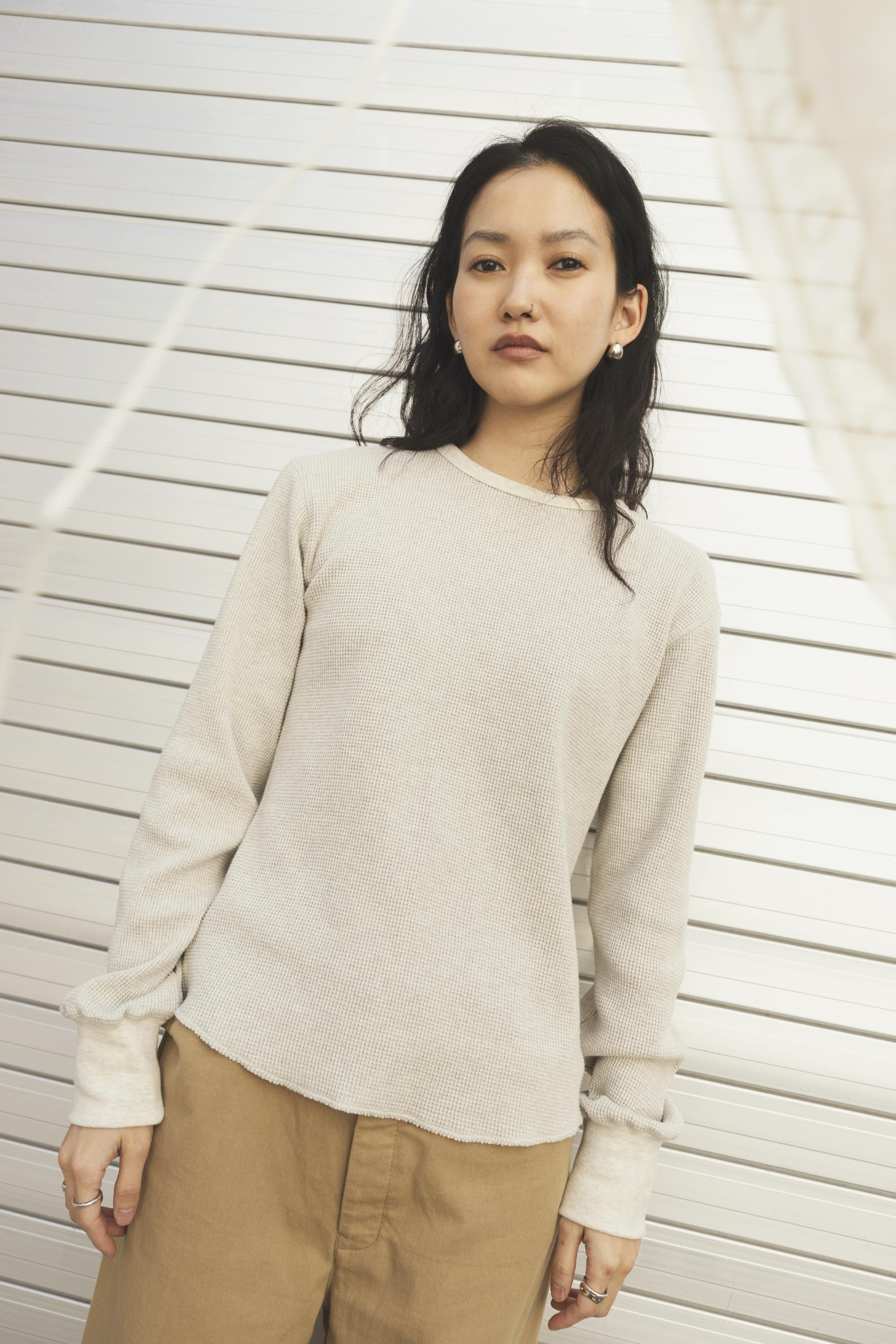 Made from a durable waffle fabric blend of 94%cotton and 6% spandex. It has a comfortable mid weight feel, making it easy to wear on its own or layer with other pieces as well. The simple, timeless design works well in any season. The neckline and sleeve hems are finished with firm ribbed trims in a subtle tone on tone color for clean and refined look. The stretchy waffle texture feels ultra soft on the skin and creates a natural silhouette. The hem is finished with an overlock stitch for a slightly raw detail, adding our signature relaxed mood. โจAvailable in Oat Melange and White.