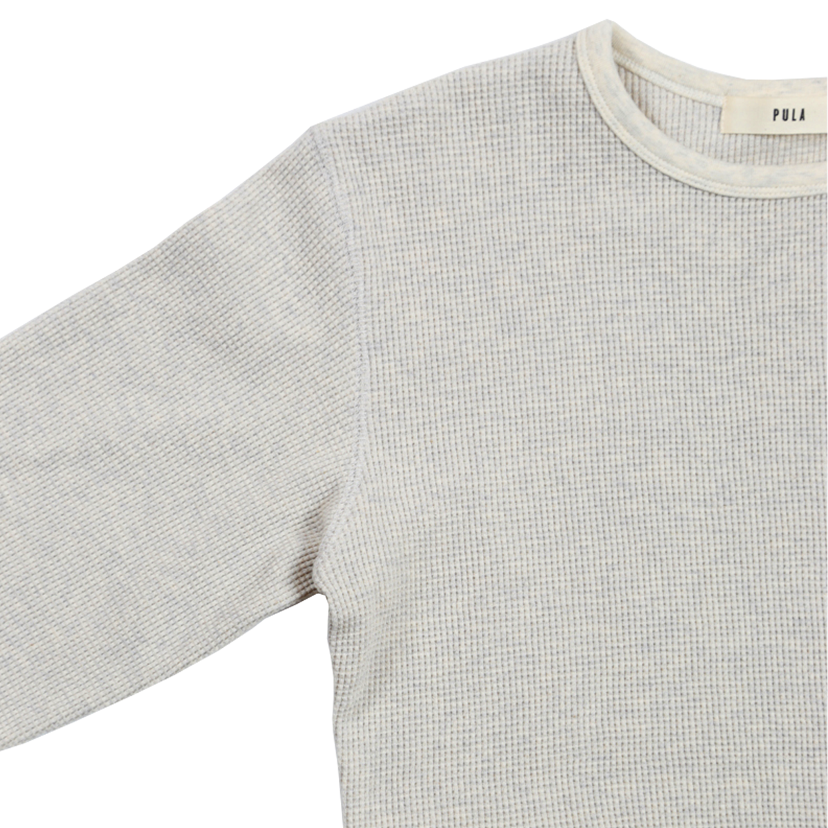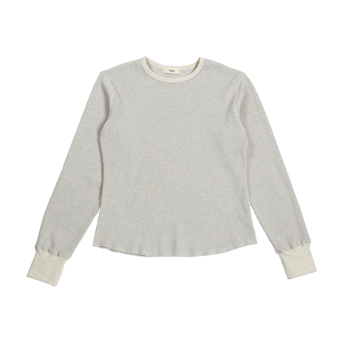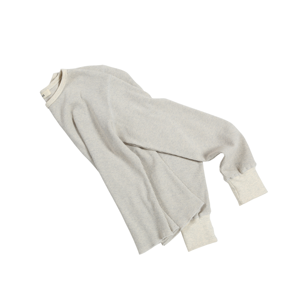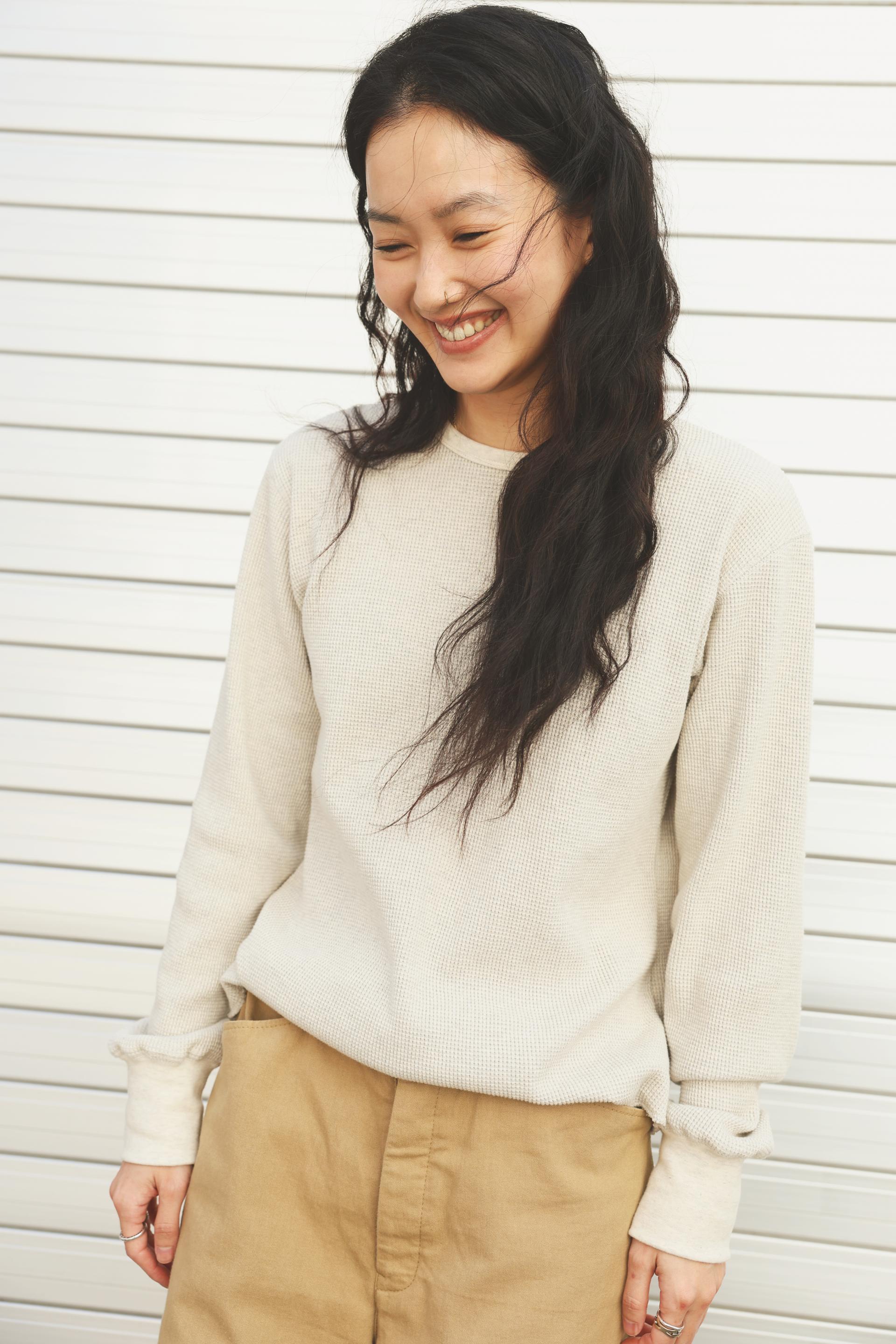 Made from a durable waffle fabric blend of 94%cotton and 6% spandex. It has a comfortable mid weight feel, making it easy to wear on its own or layer with other pieces as well. The simple, timeless design works well in any season. The neckline and sleeve hems are finished with firm ribbed trims in a subtle tone on tone color for clean and refined look. The stretchy waffle texture feels ultra soft on the skin and creates a natural silhouette. The hem is finished with an overlock stitch for a slightly raw detail, adding our signature relaxed mood. โจAvailable in Oat Melange and White.