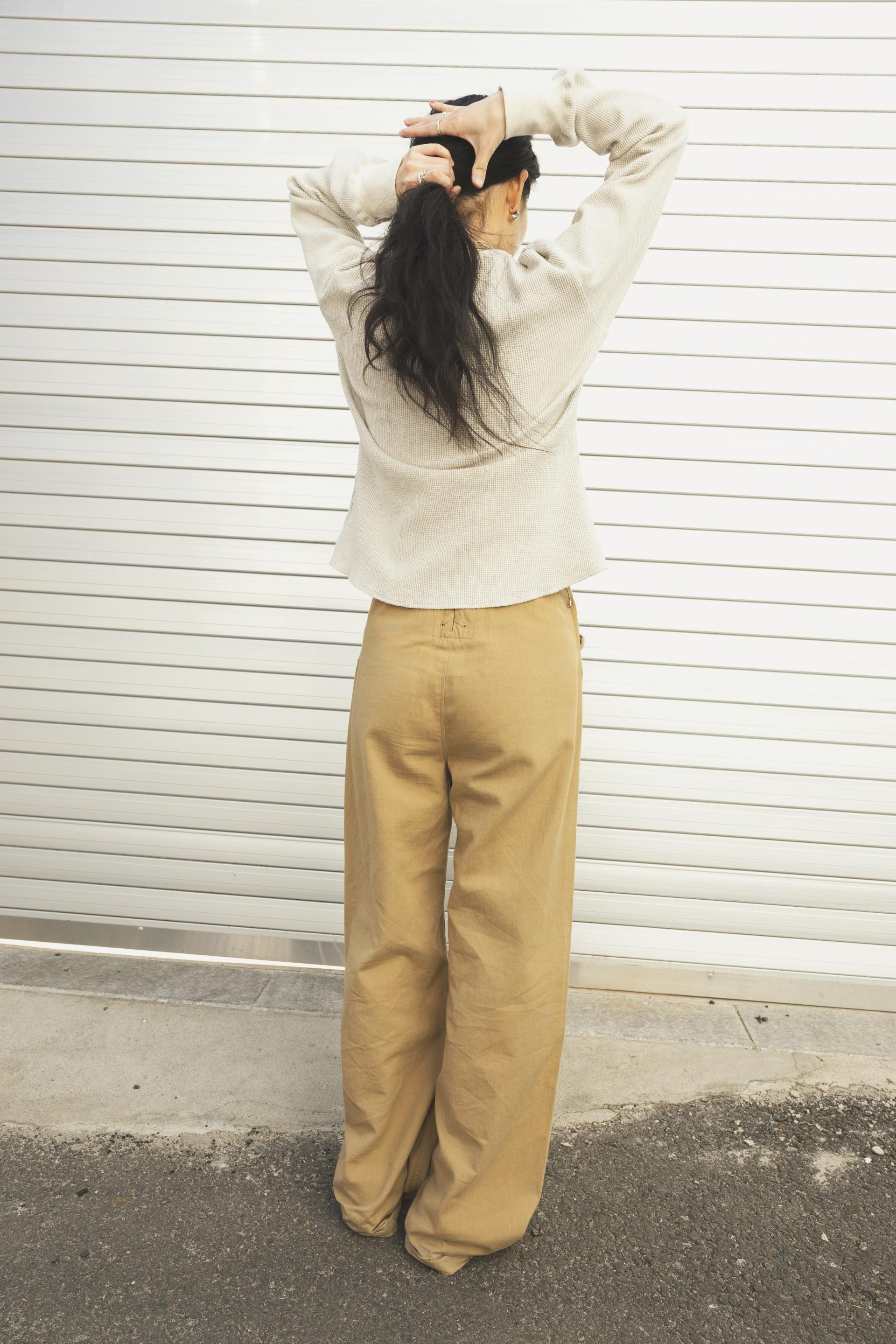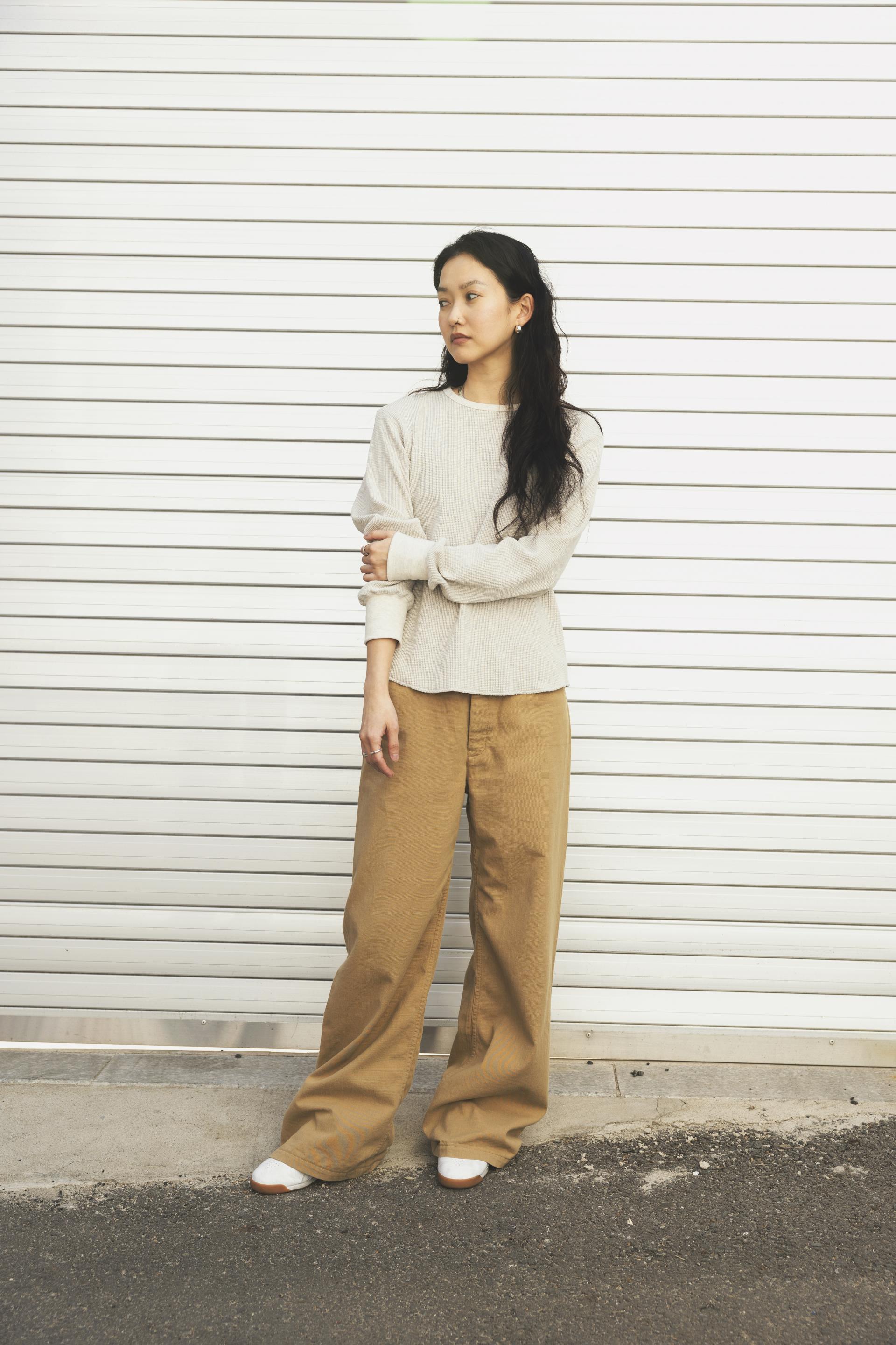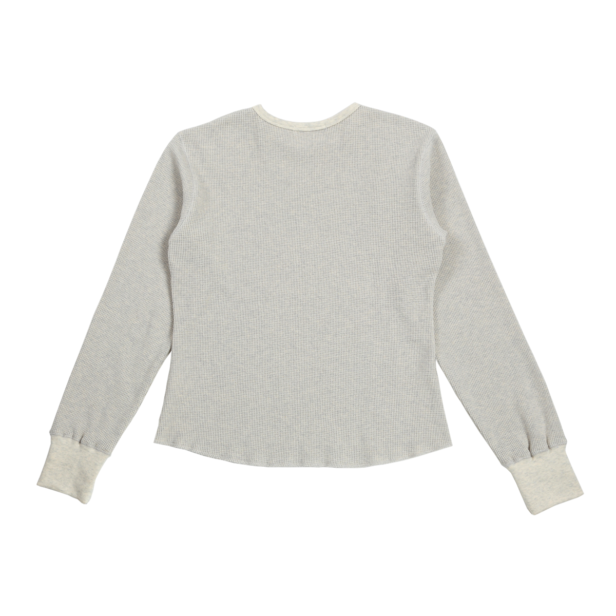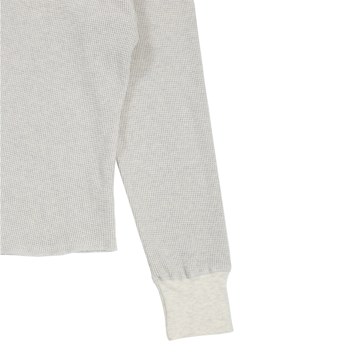 Made from a durable waffle fabric blend of 94%cotton and 6% spandex. It has a comfortable mid weight feel, making it easy to wear on its own or layer with other pieces as well. The simple, timeless design works well in any season. The neckline and sleeve hems are finished with firm ribbed trims in a subtle tone on tone color for clean and refined look. The stretchy waffle texture feels ultra soft on the skin and creates a natural silhouette. The hem is finished with an overlock stitch for a slightly raw detail, adding our signature relaxed mood. โจAvailable in Oat Melange and White.
