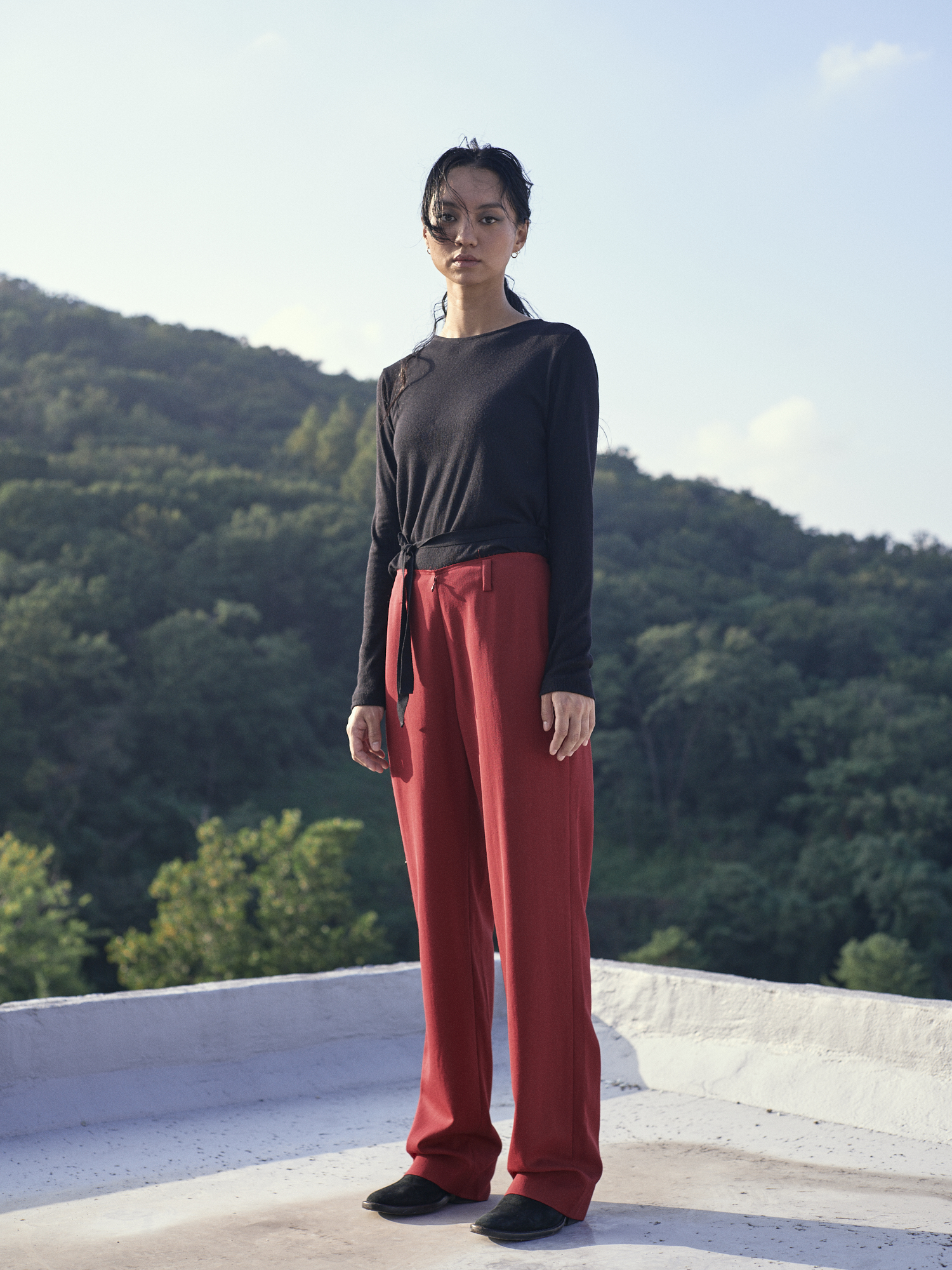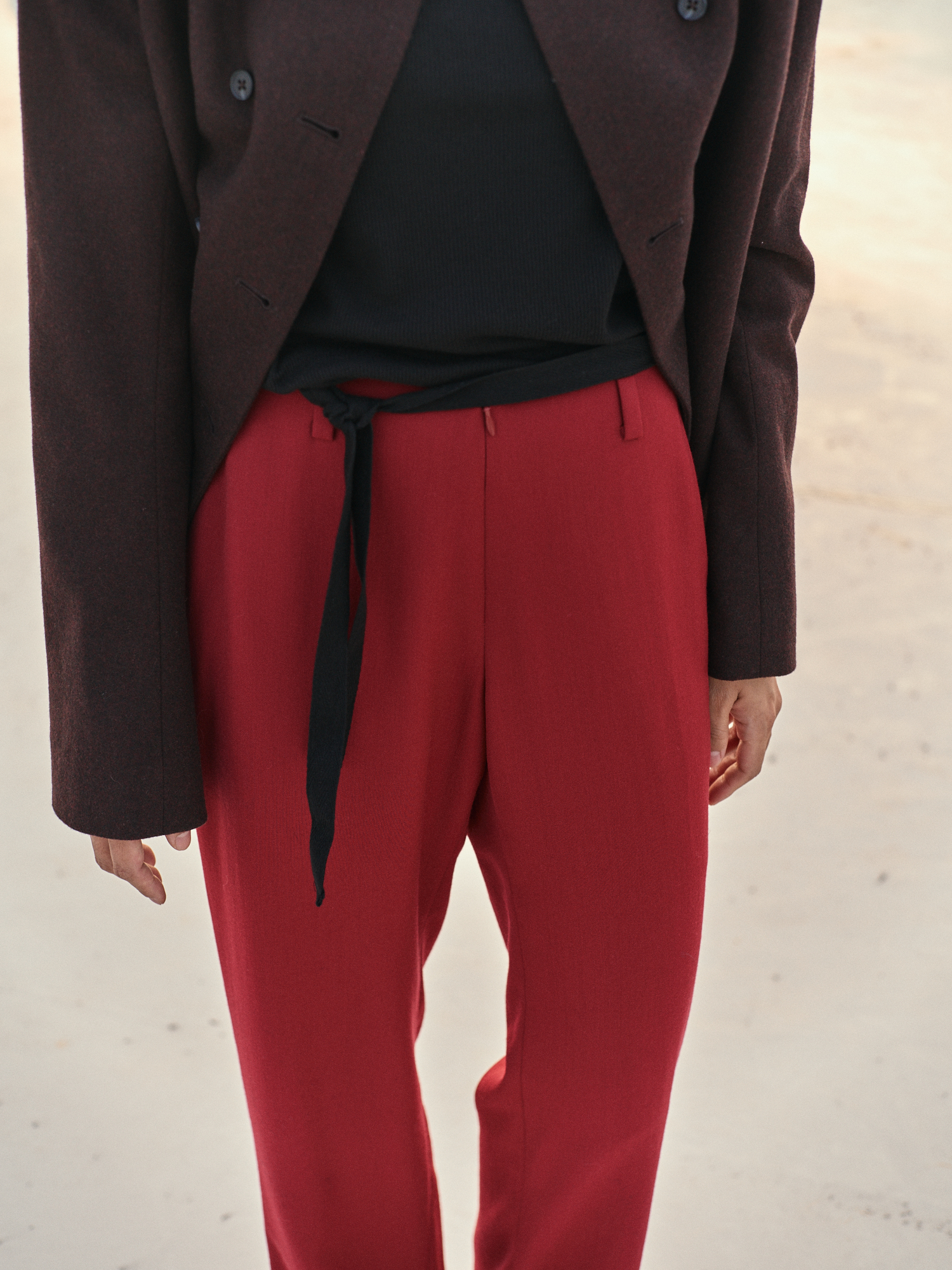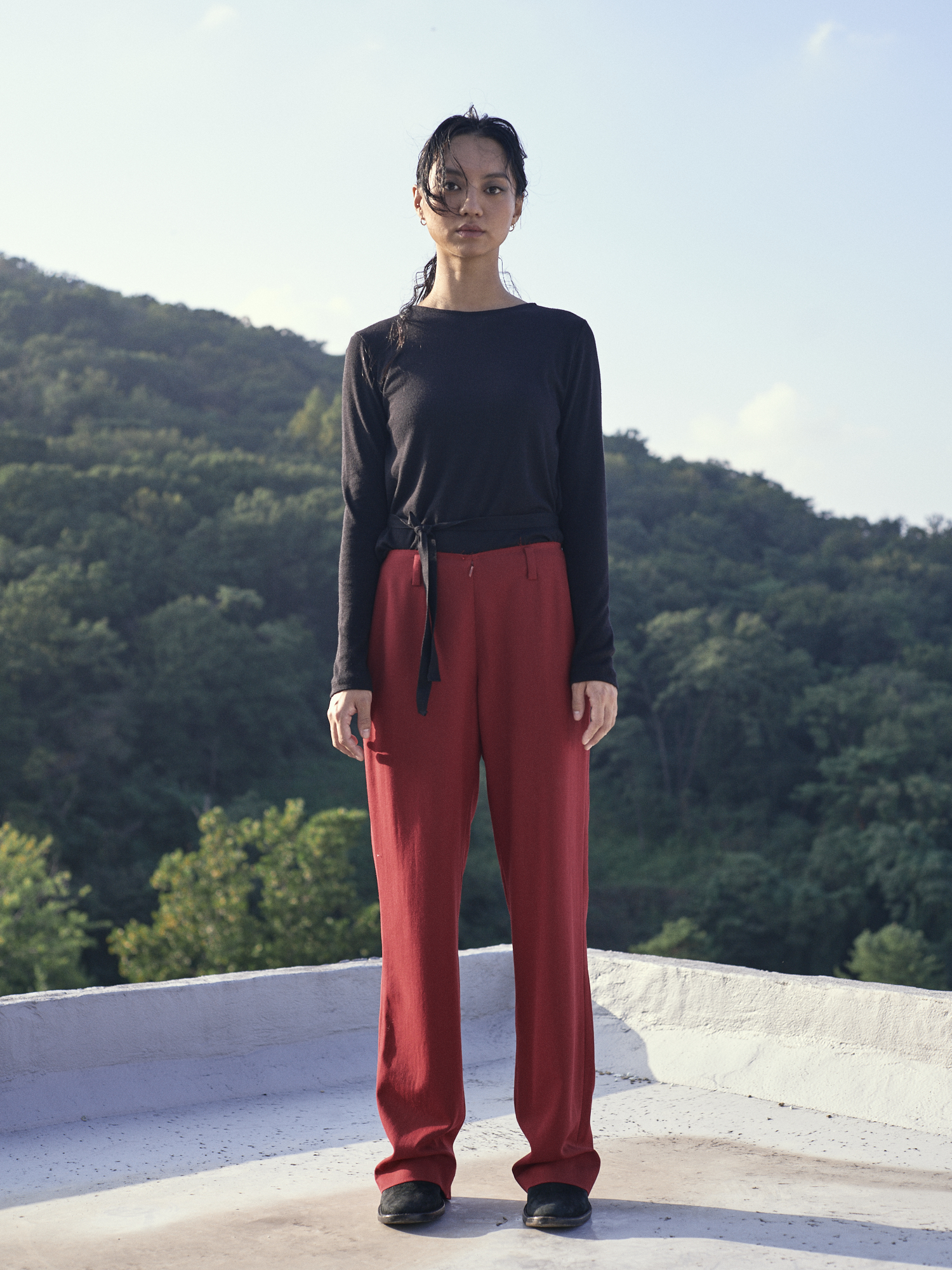 플루이드 울 소재의 플랫한 실루엣의 로우 프론트 스트레이트 팬츠 입니다.