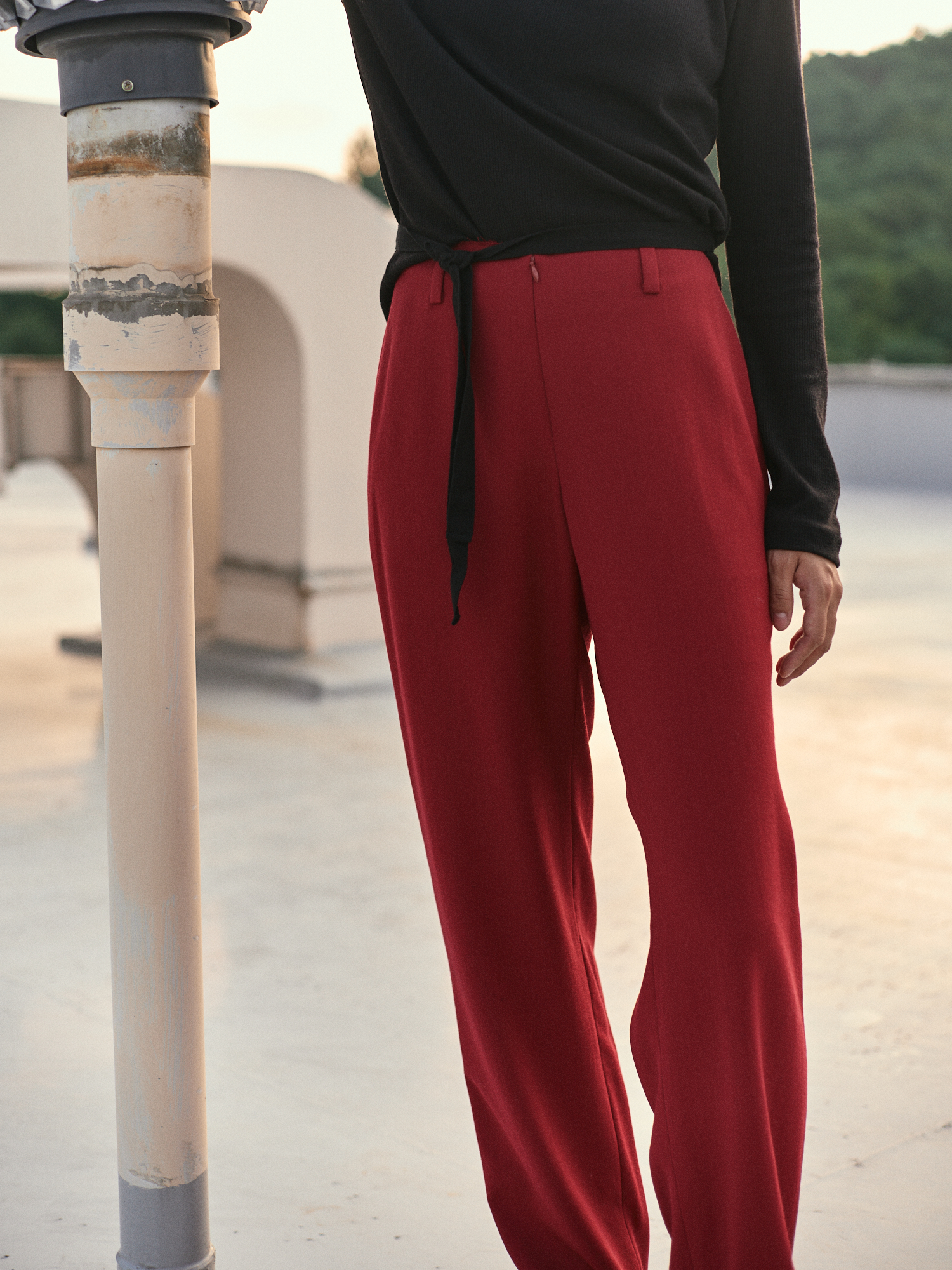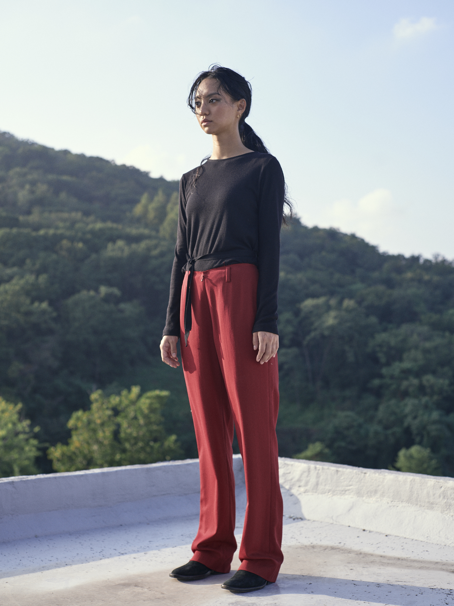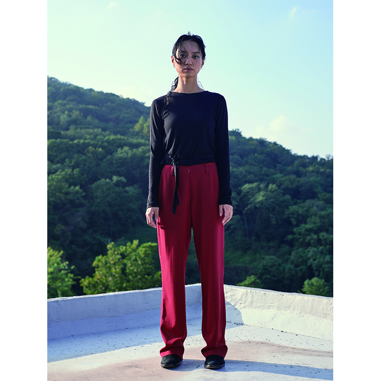 플루이드 울 소재의 플랫한 실루엣의 로우 프론트 스트레이트 팬츠 입니다.