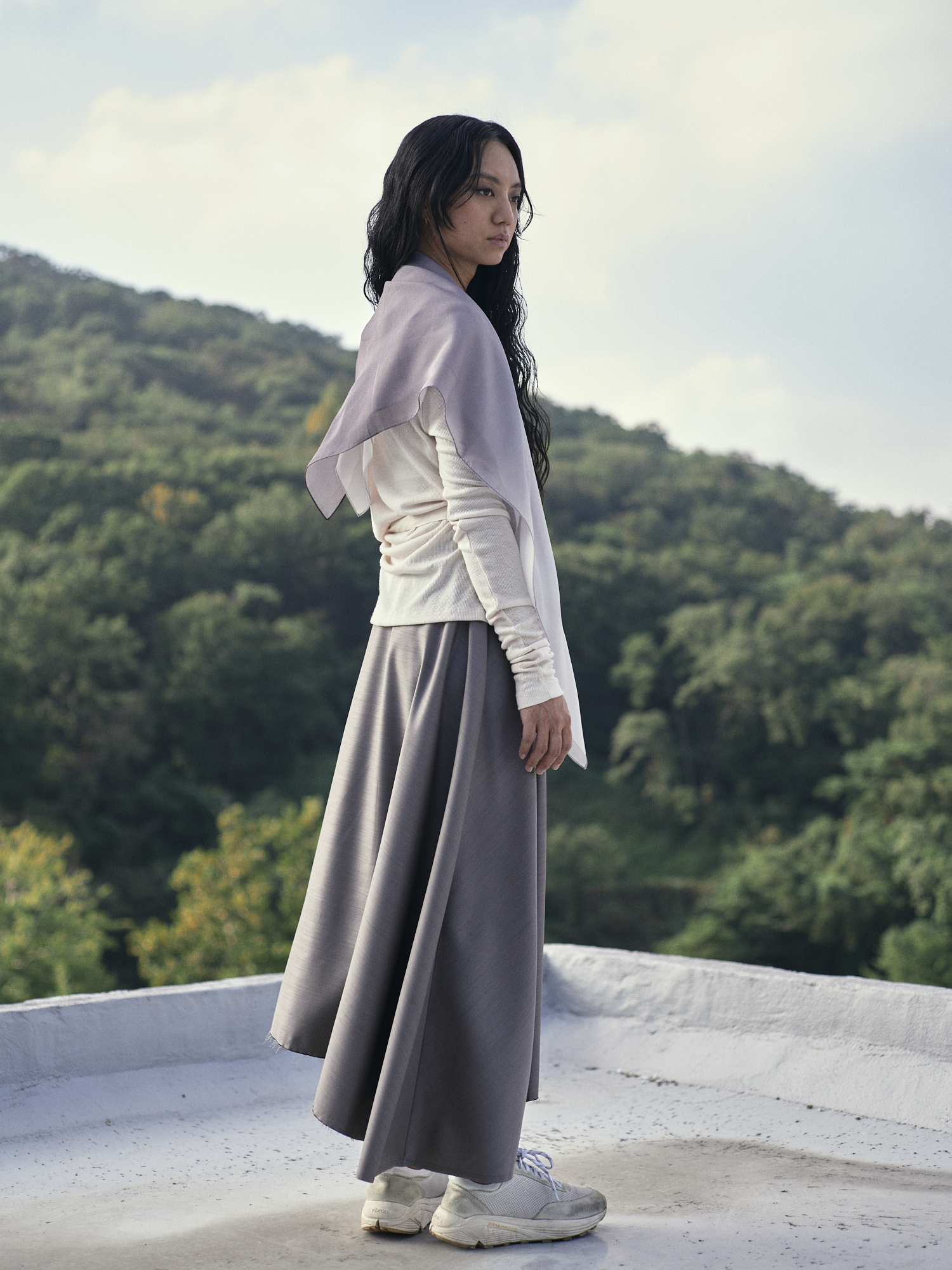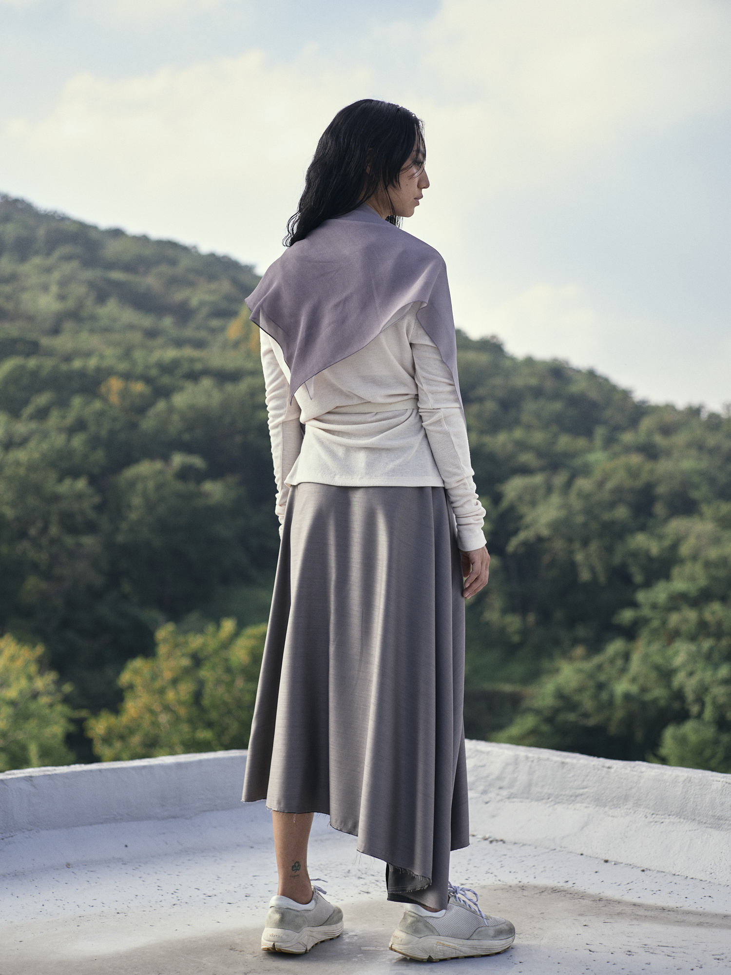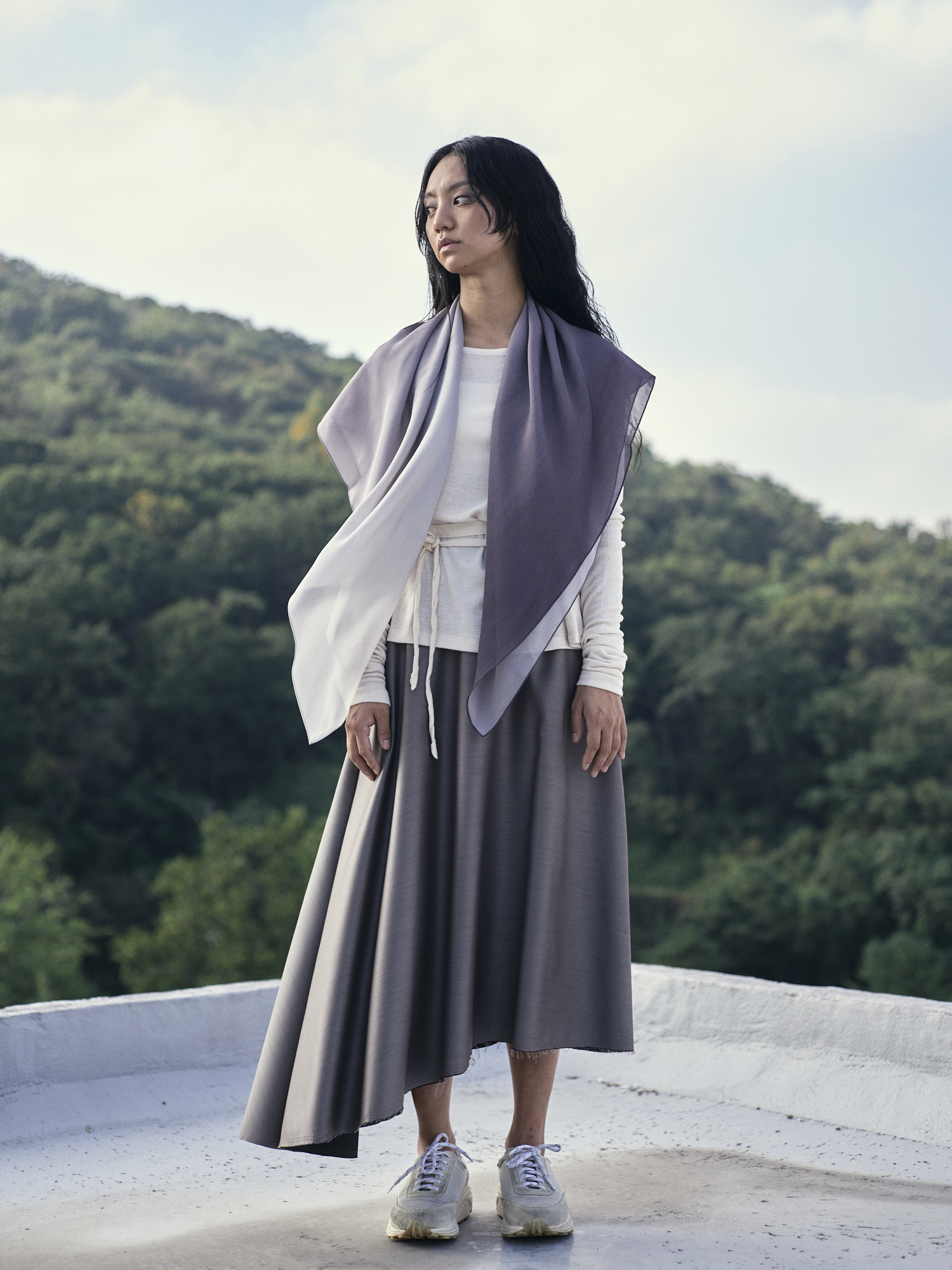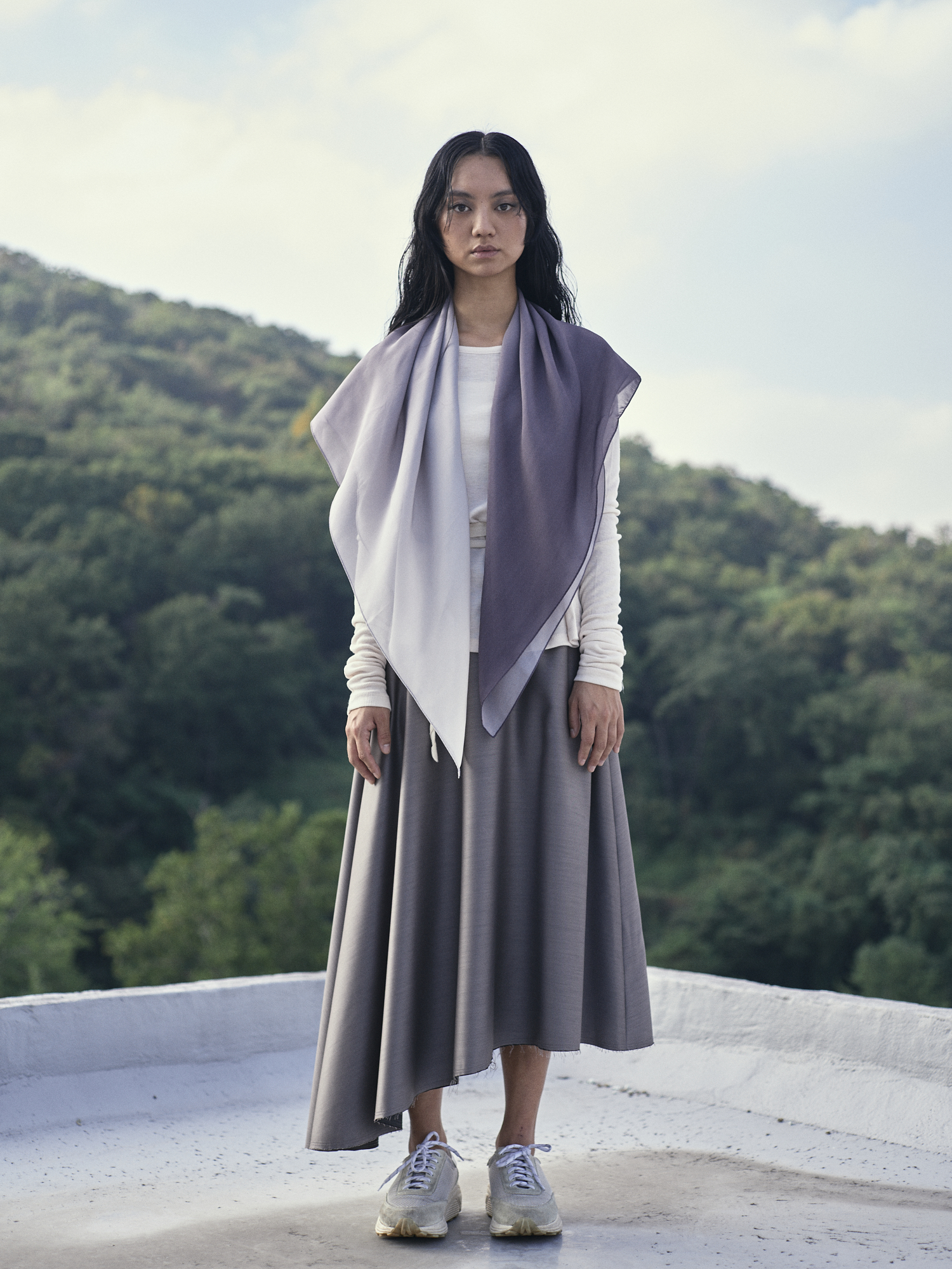 22 fw editon.01 컨셉의 레터링과 그라데이션이 적용된 오버사이즈 정사각 실크 스카프 입니다.