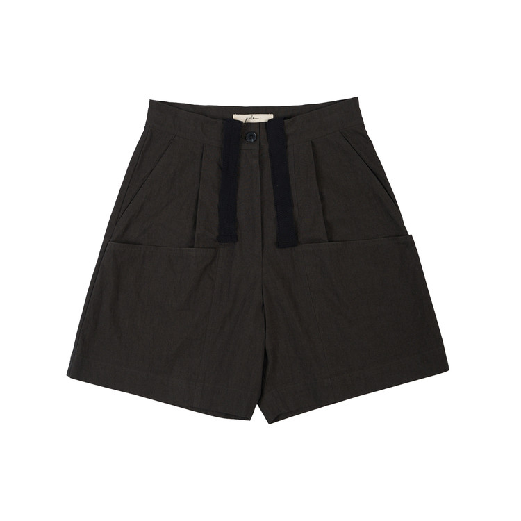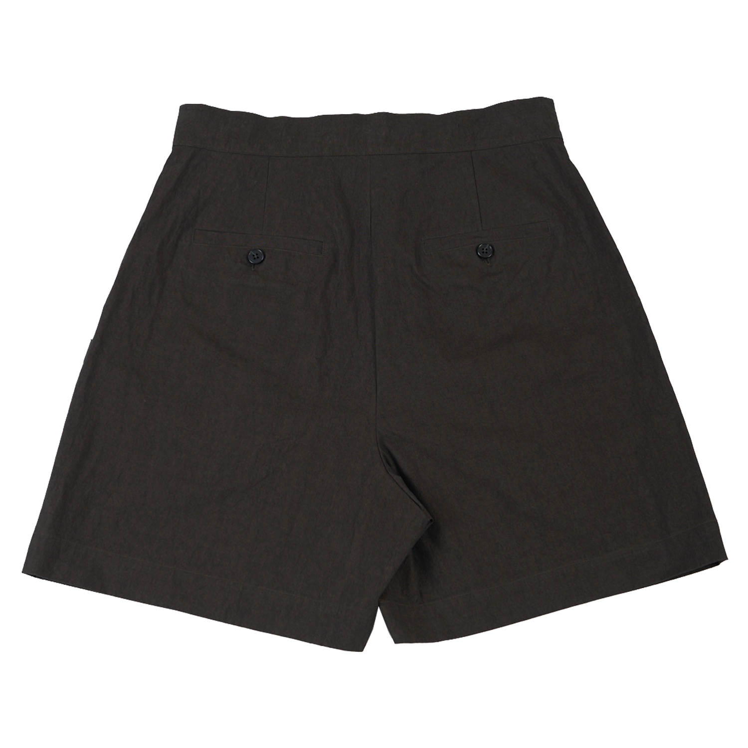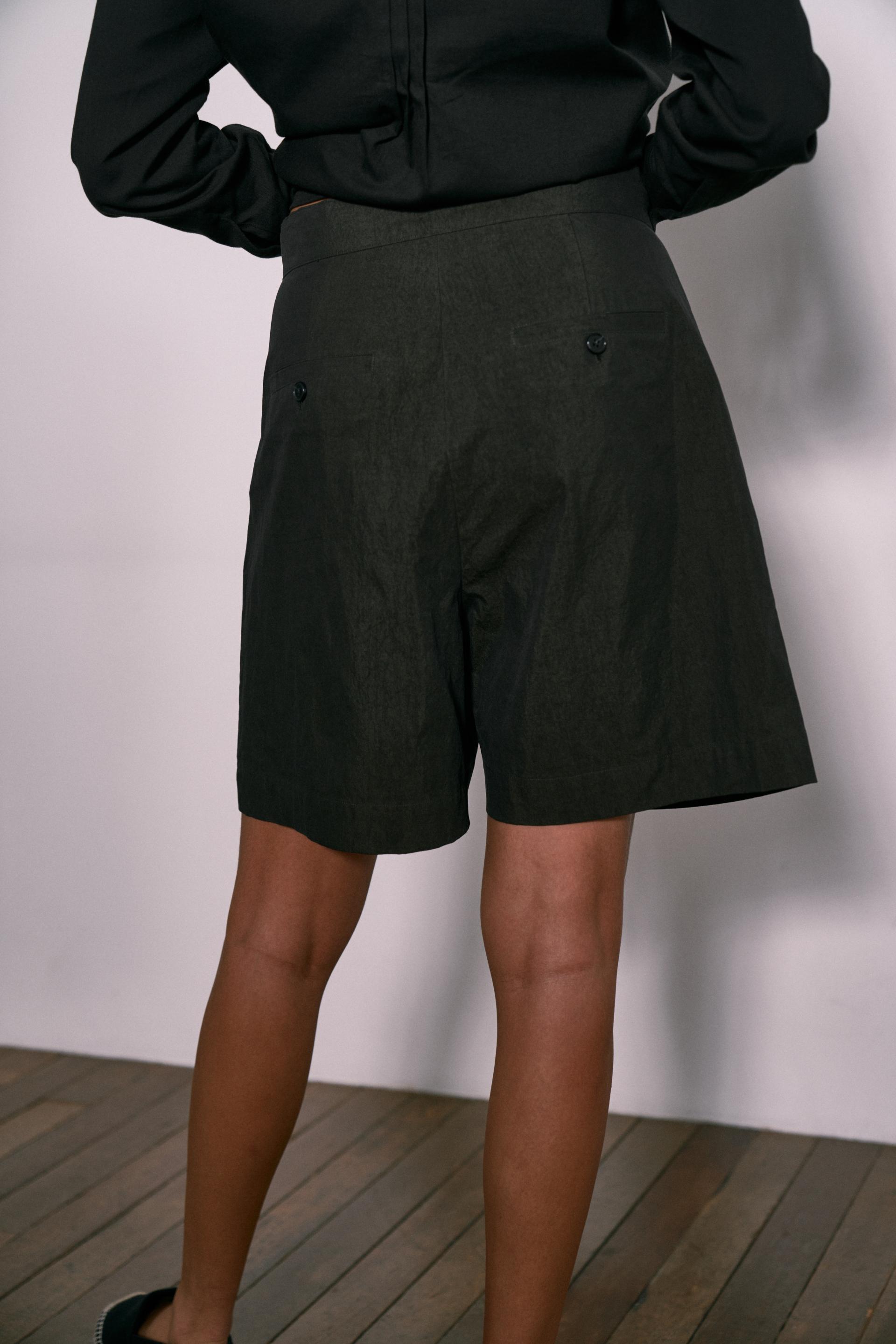 Knee length shorts with deep front pockets and side pockets in cotton-nylon. Features a wide leg fit and pleats at front. Finished with a drawstring inside of waist band and concealed zip with button at top.