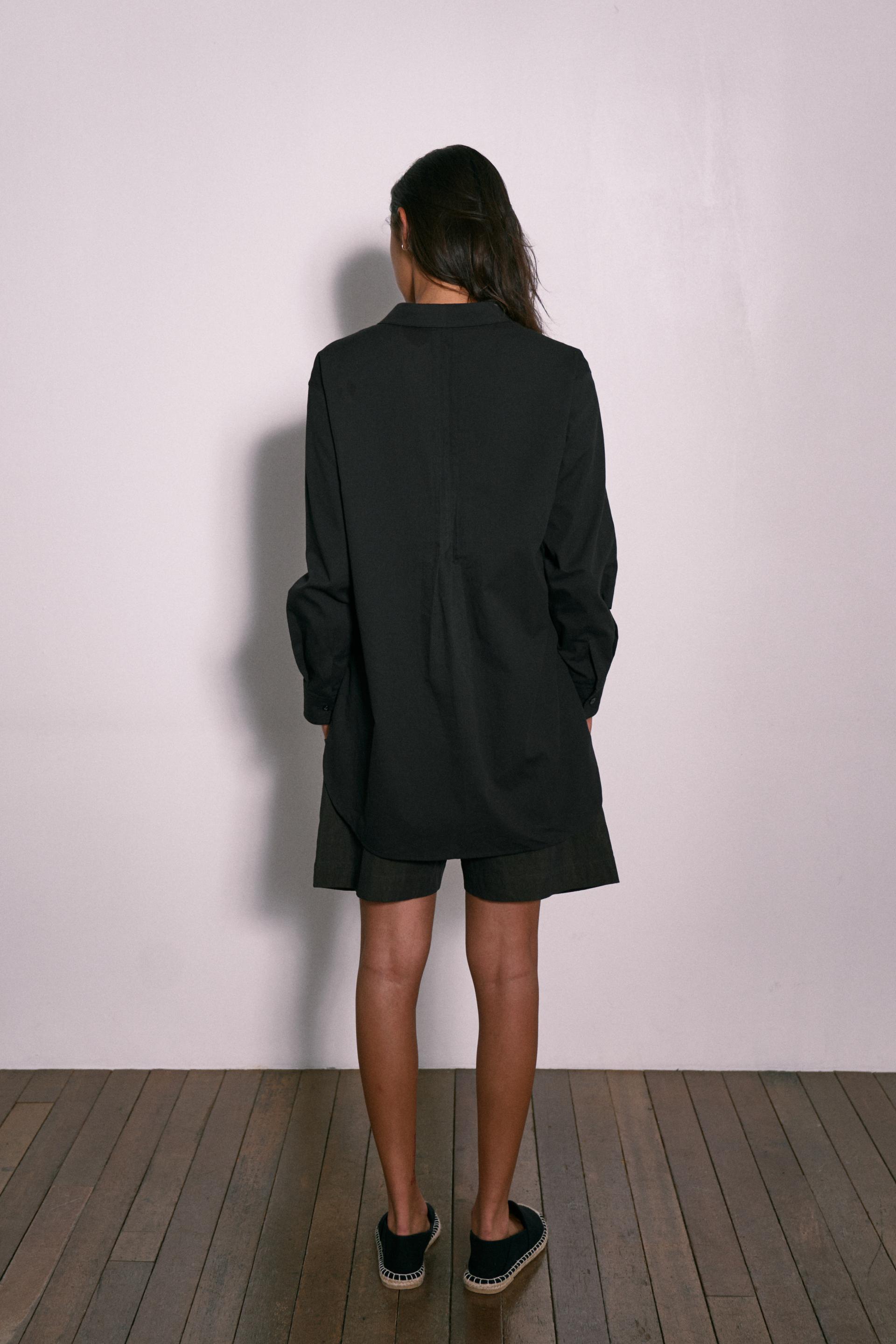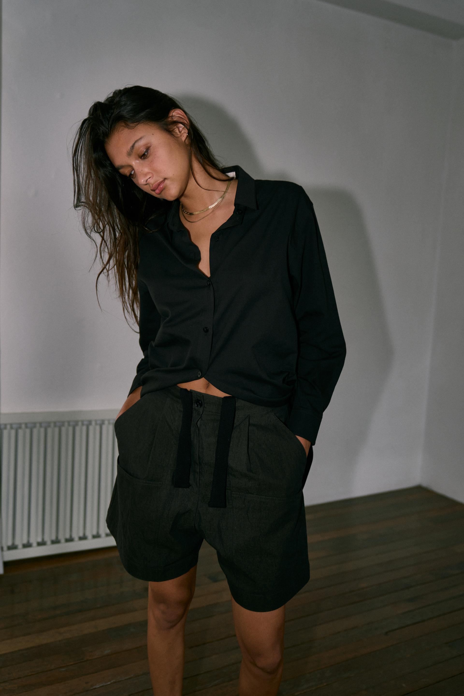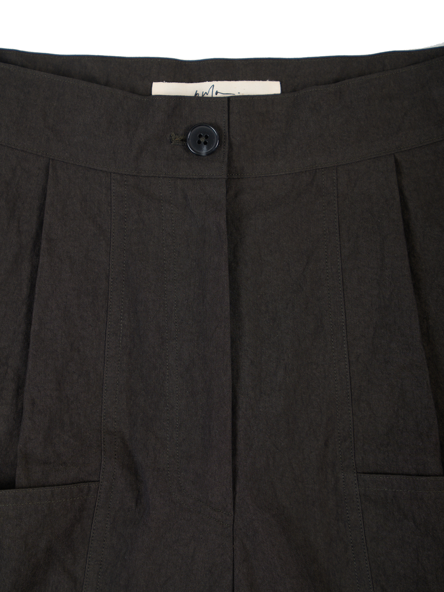 Knee length shorts with deep front pockets and side pockets in cotton-nylon. Features a wide leg fit and pleats at front. Finished with a drawstring inside of waist band and concealed zip with button at top.