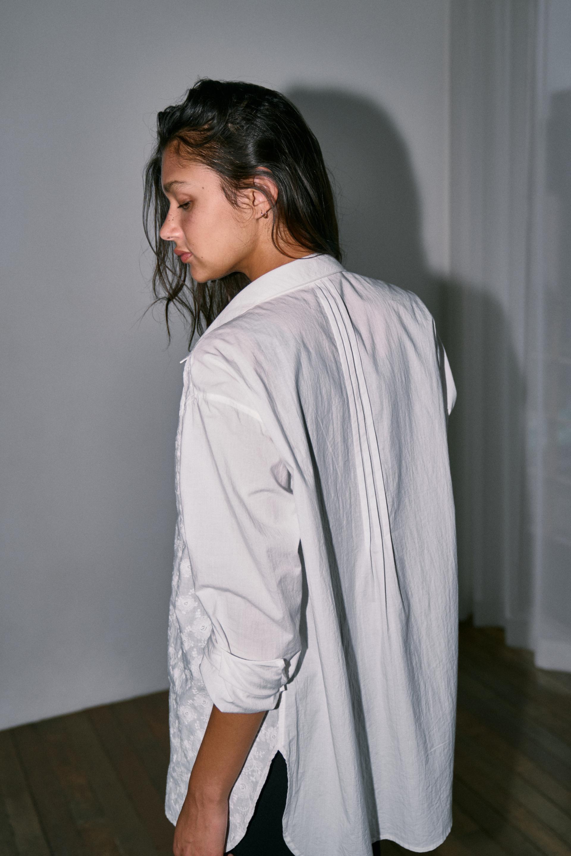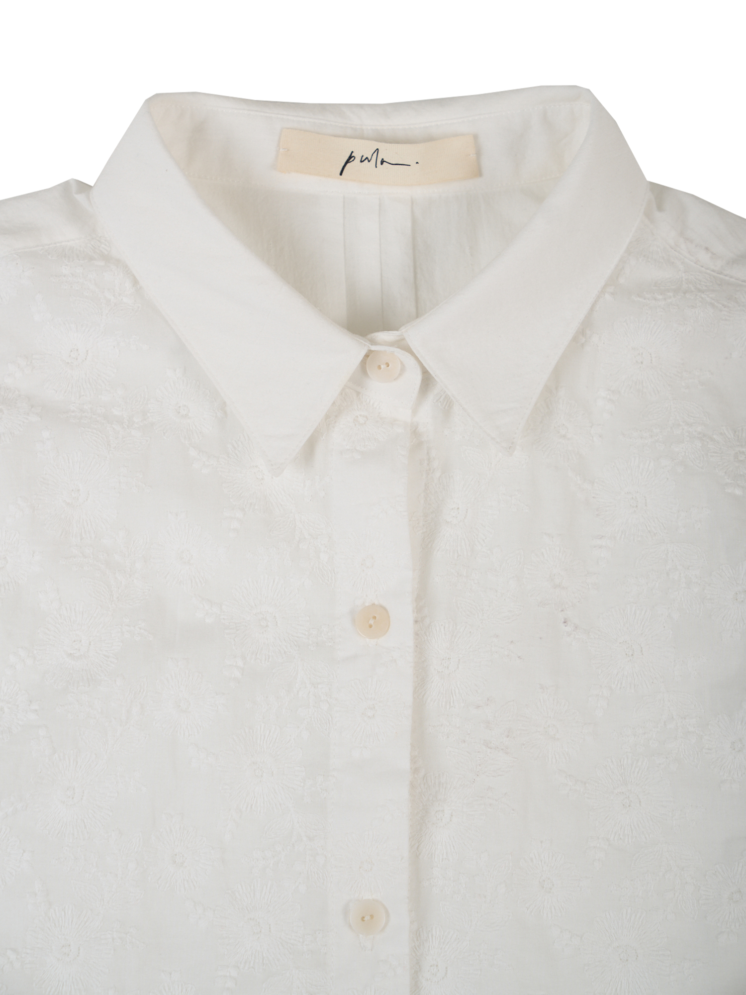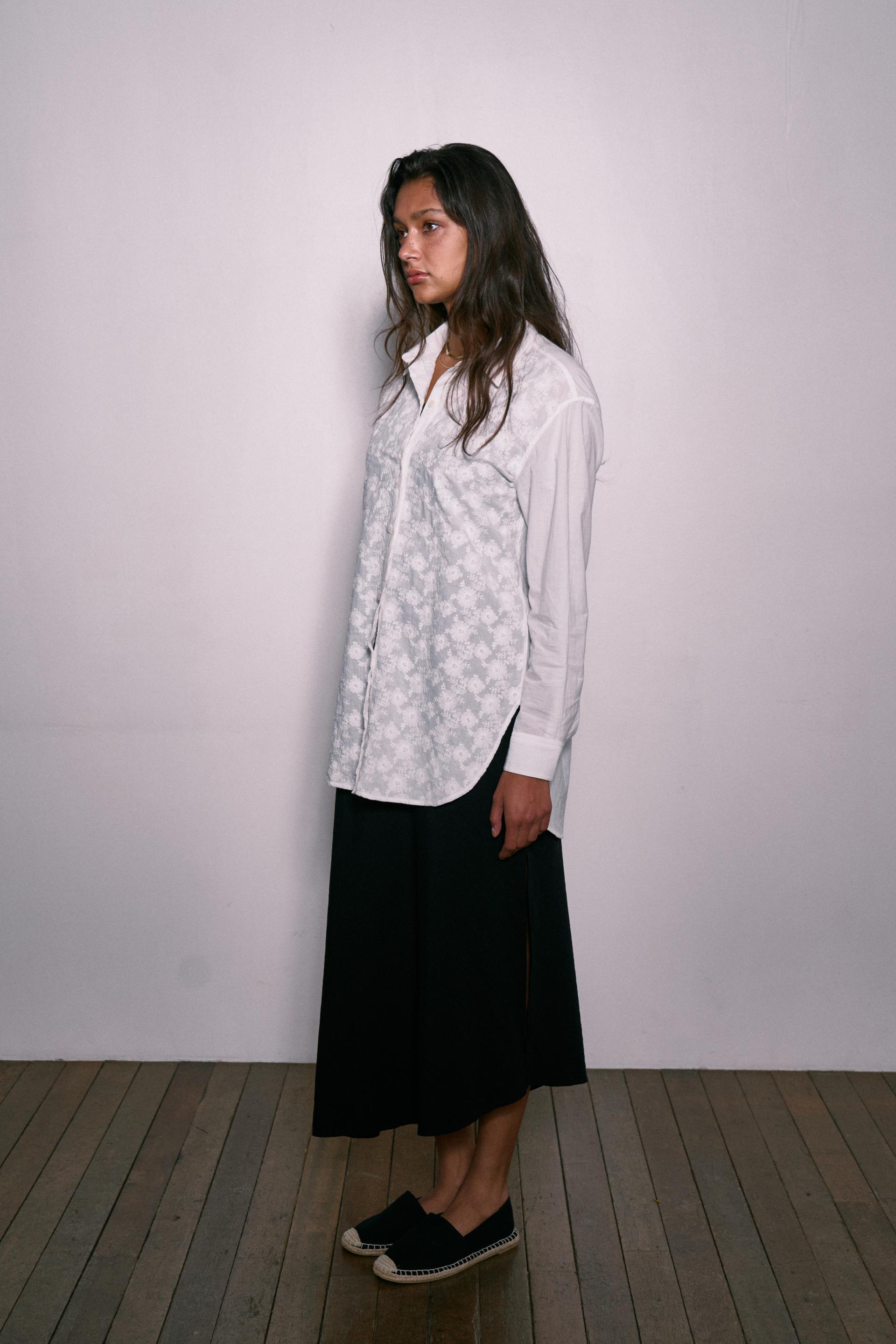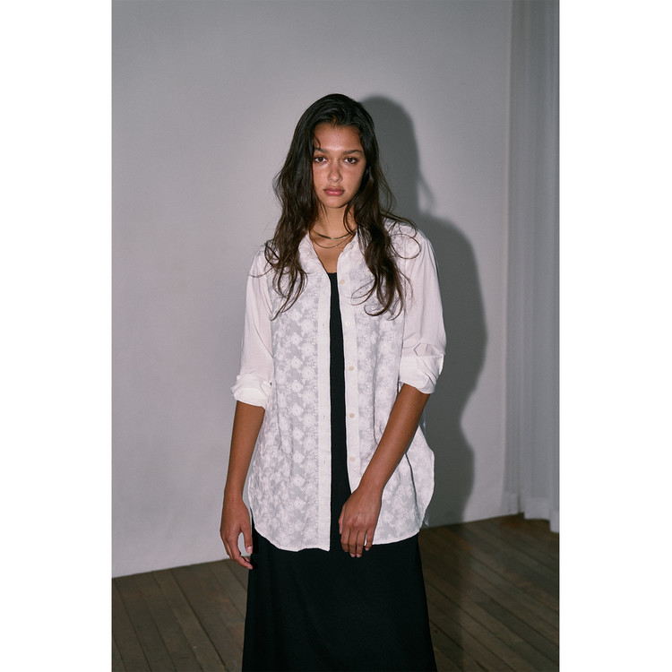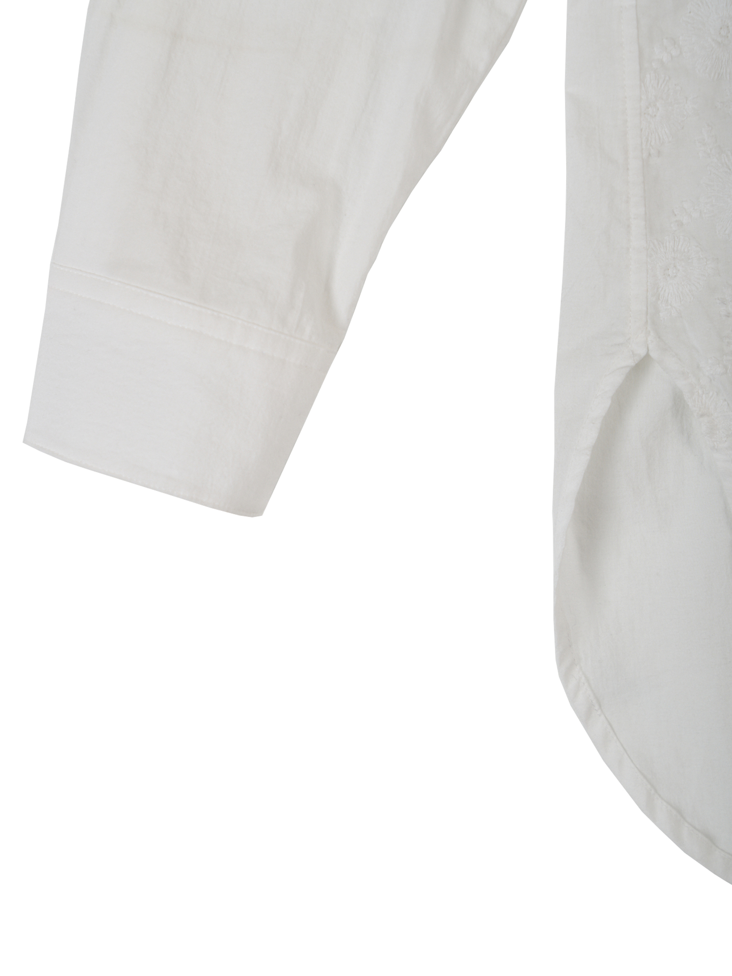 Semi-oversized shilhouette shirts in cotton. Features embroidery details at front, pin-tuck details at back and side splits with a long curved front and back.