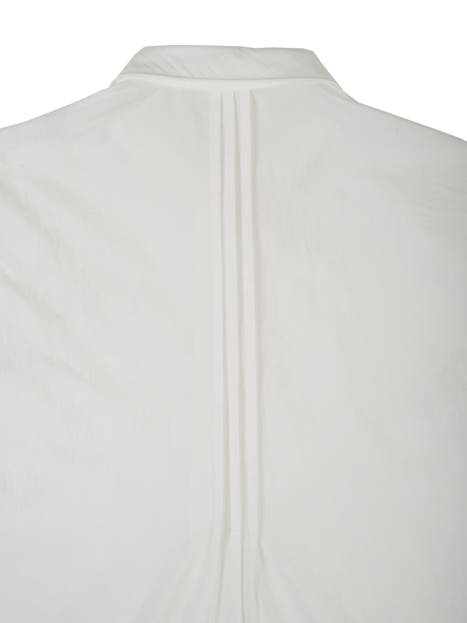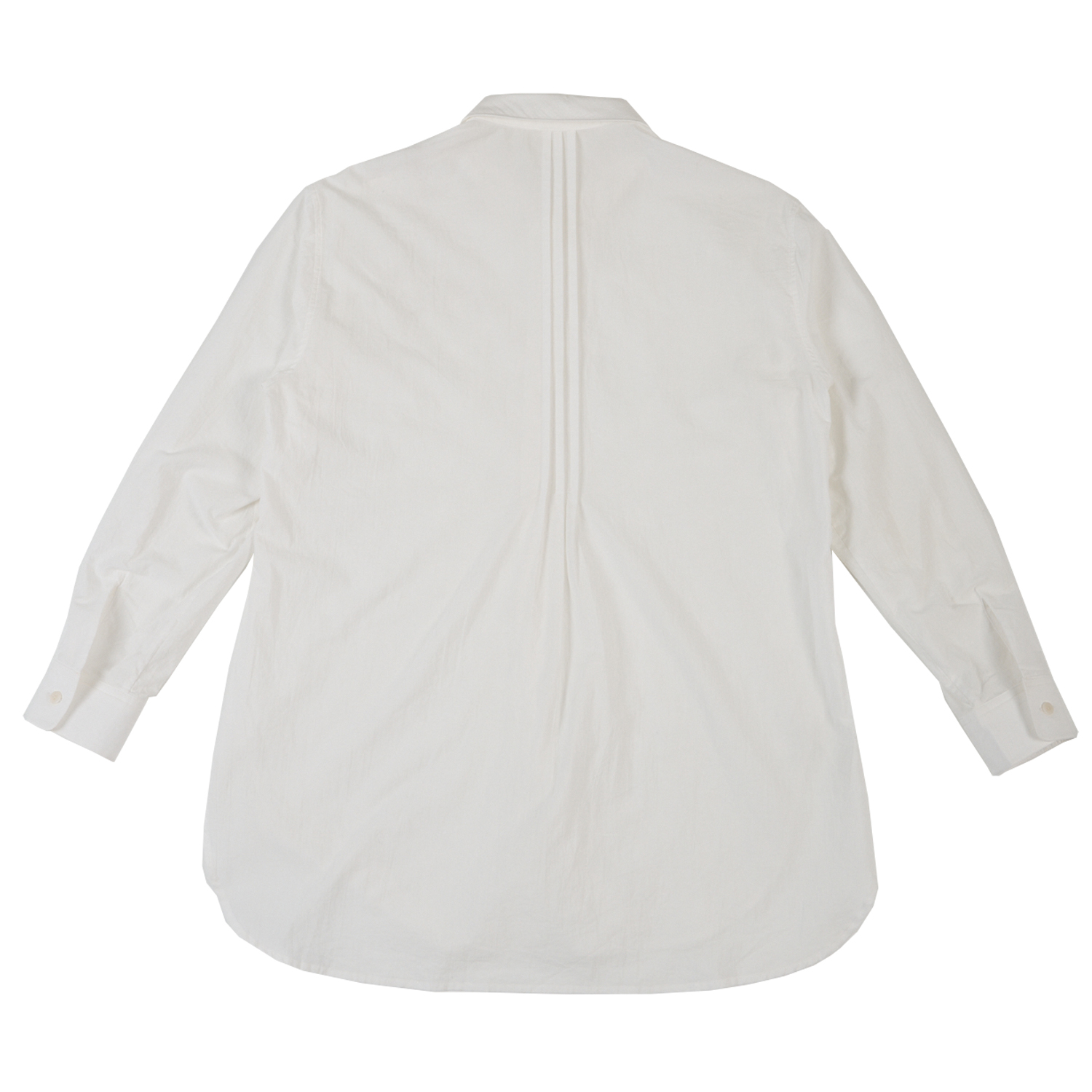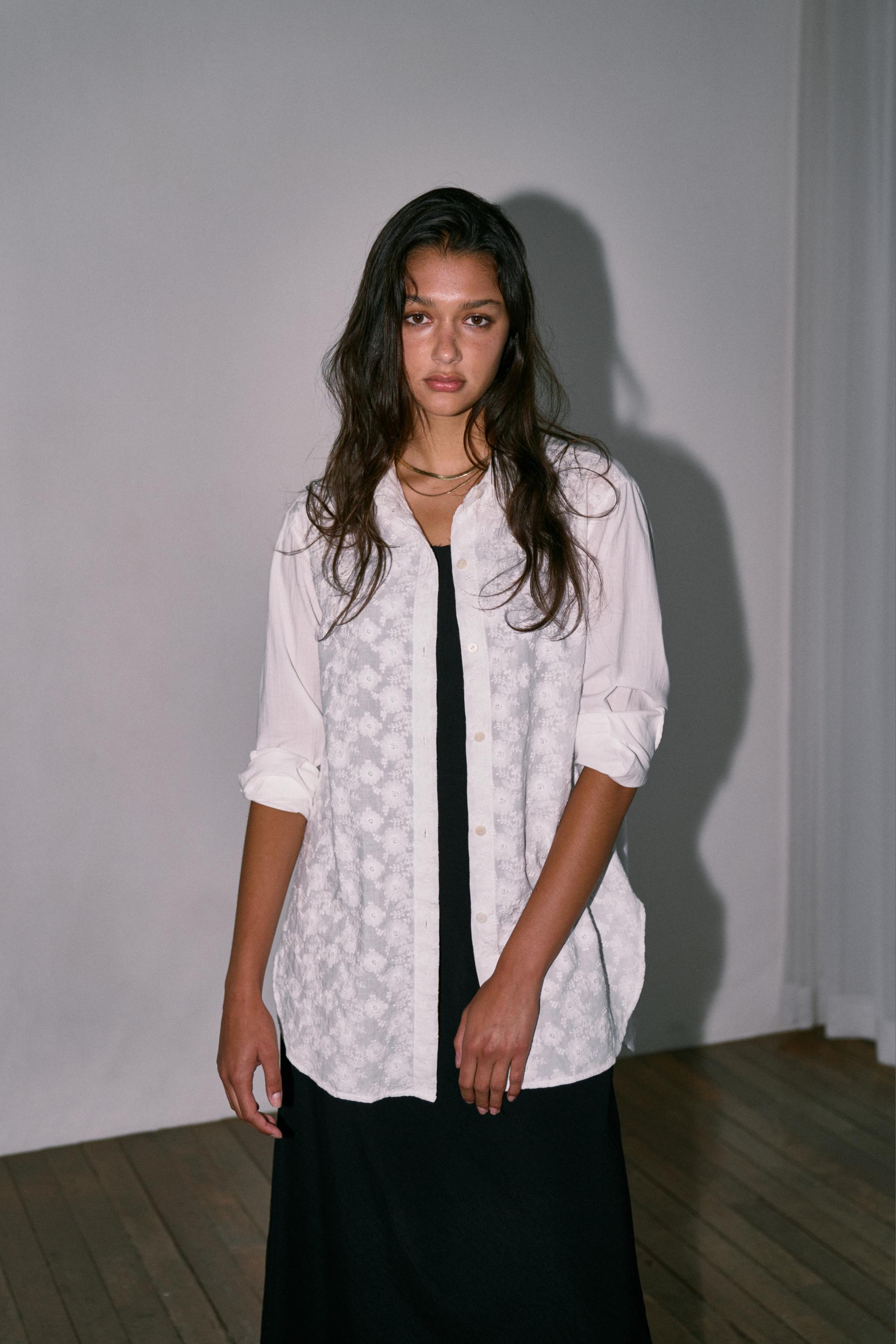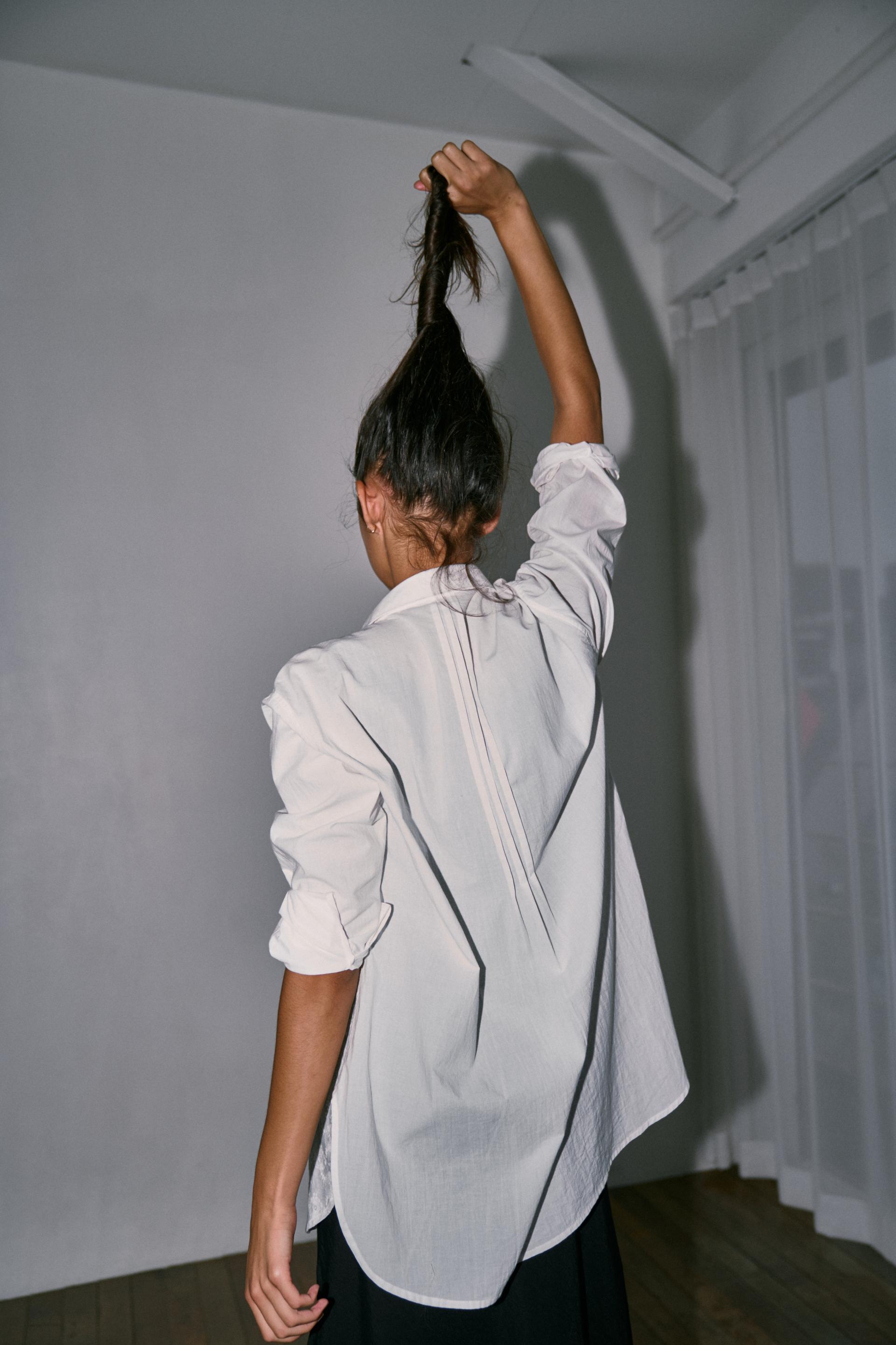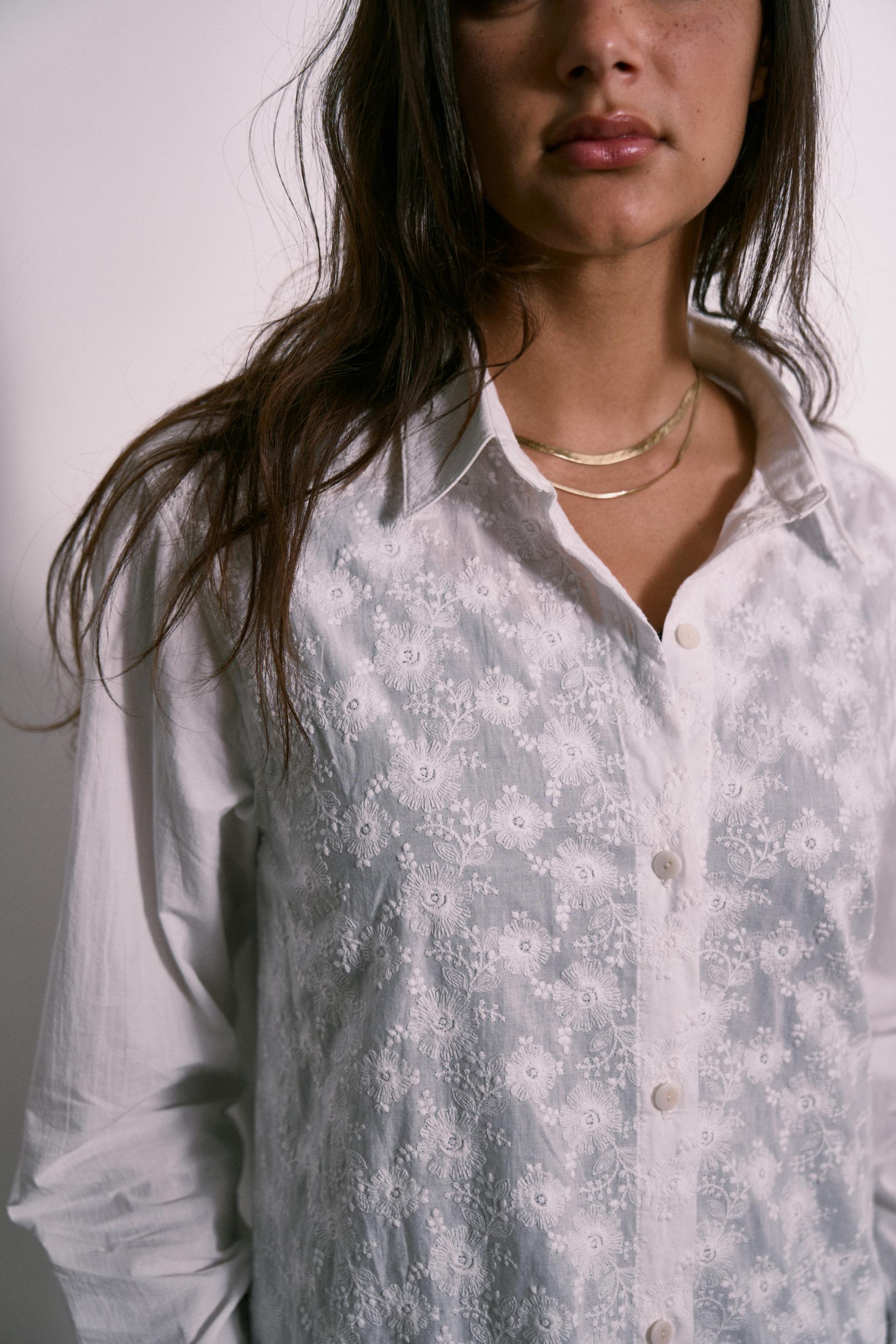 Semi-oversized shilhouette shirts in cotton. Features embroidery details at front, pin-tuck details at back and side splits with a long curved front and back.
