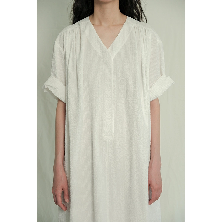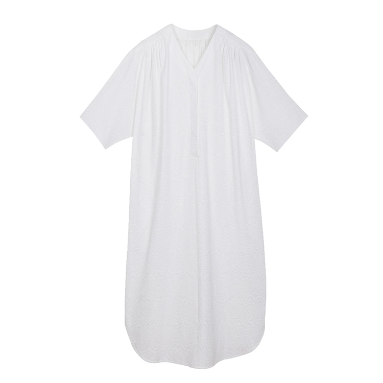 TUNIC DRESS WITH A CURVED HEM IN LIGHT WEIGHT SEERSUCKER, WASHED COTTON FABRIC. FEATURES A V-LINE NECK WITH SHIRRING DETAILS ON FRONT SHOULDERS AND BACK AND CONCEALED SIDE SEAM POCKETS. FINISHED WITH HIDDEN BUTTONS DOWN ON FRONT.