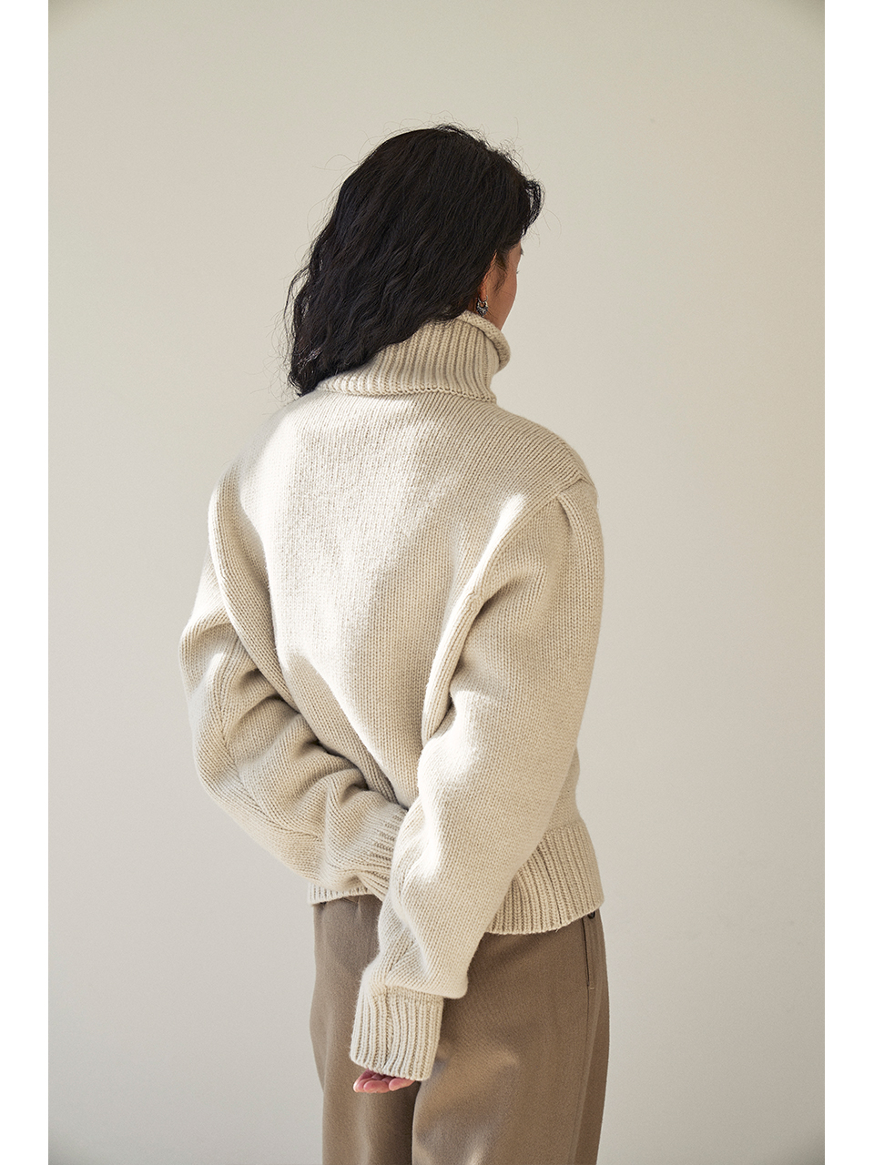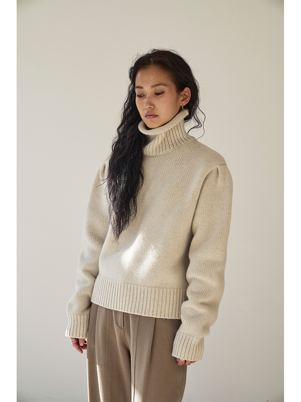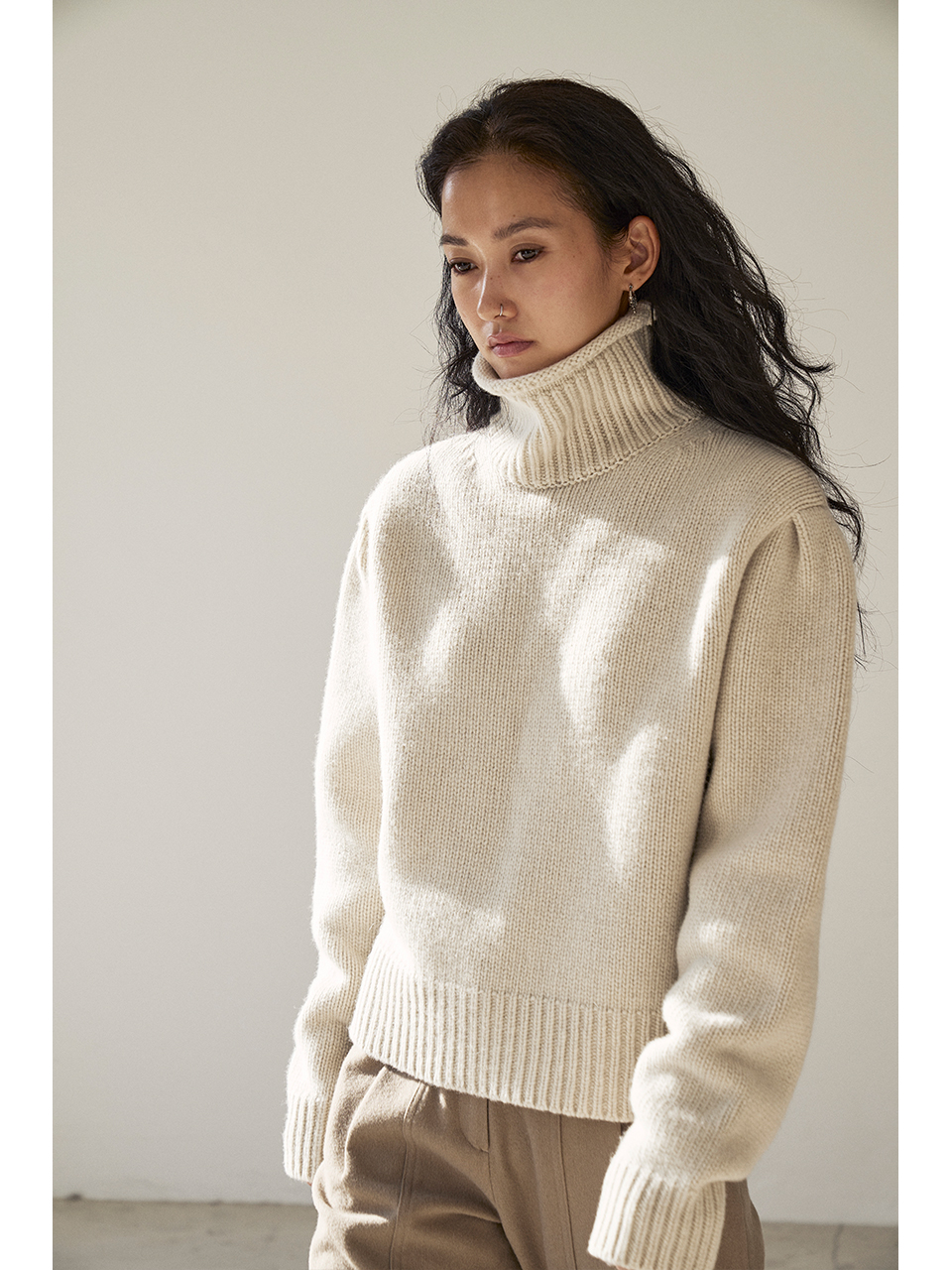 볼륨감 있는 퍼프 슬리브 실루엣의 터틀넥 스웨터입니다.