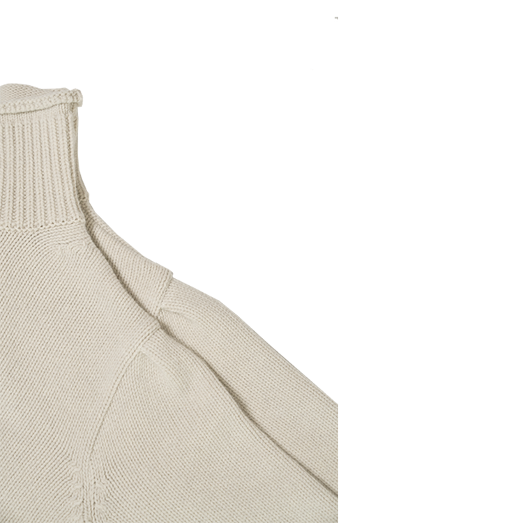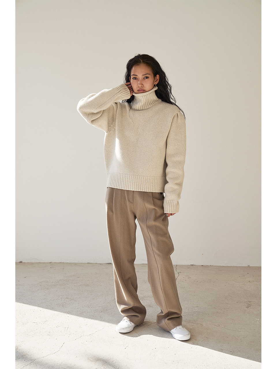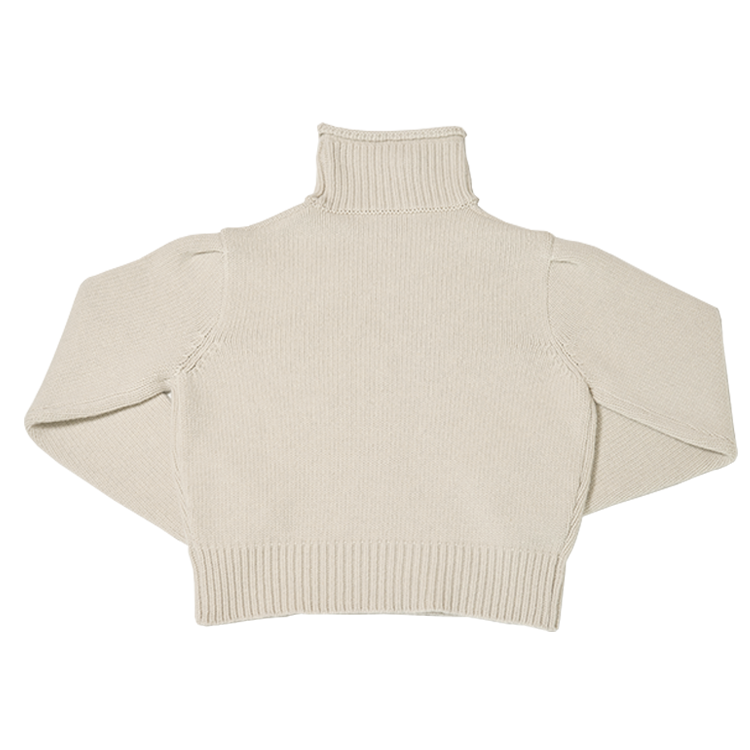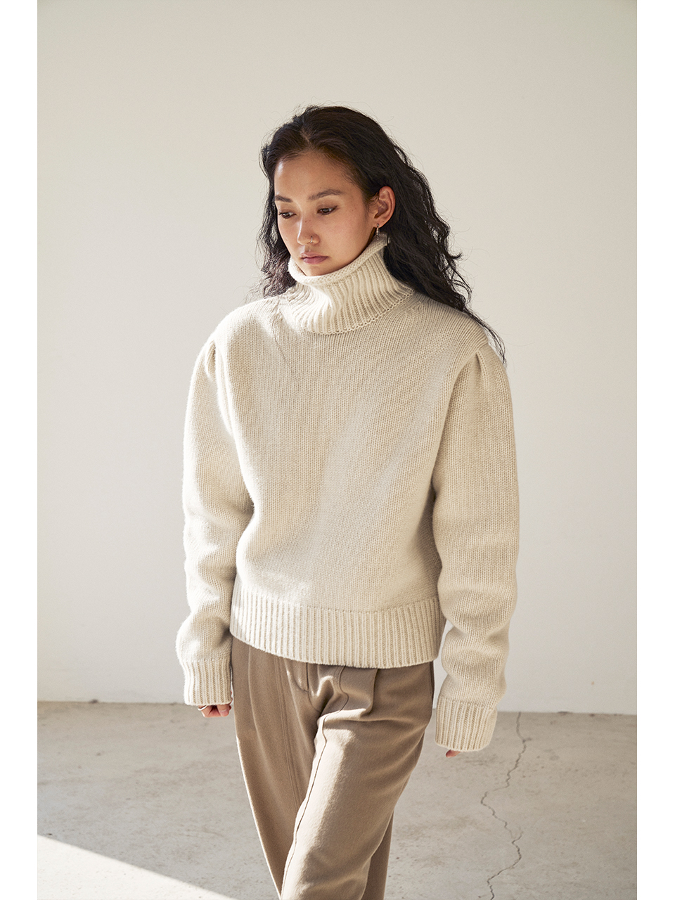 볼륨감 있는 퍼프 슬리브 실루엣의 터틀넥 스웨터입니다.