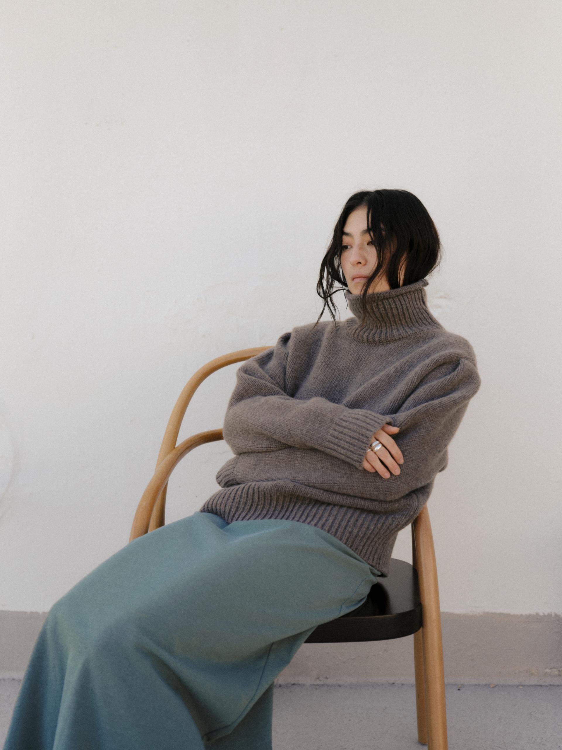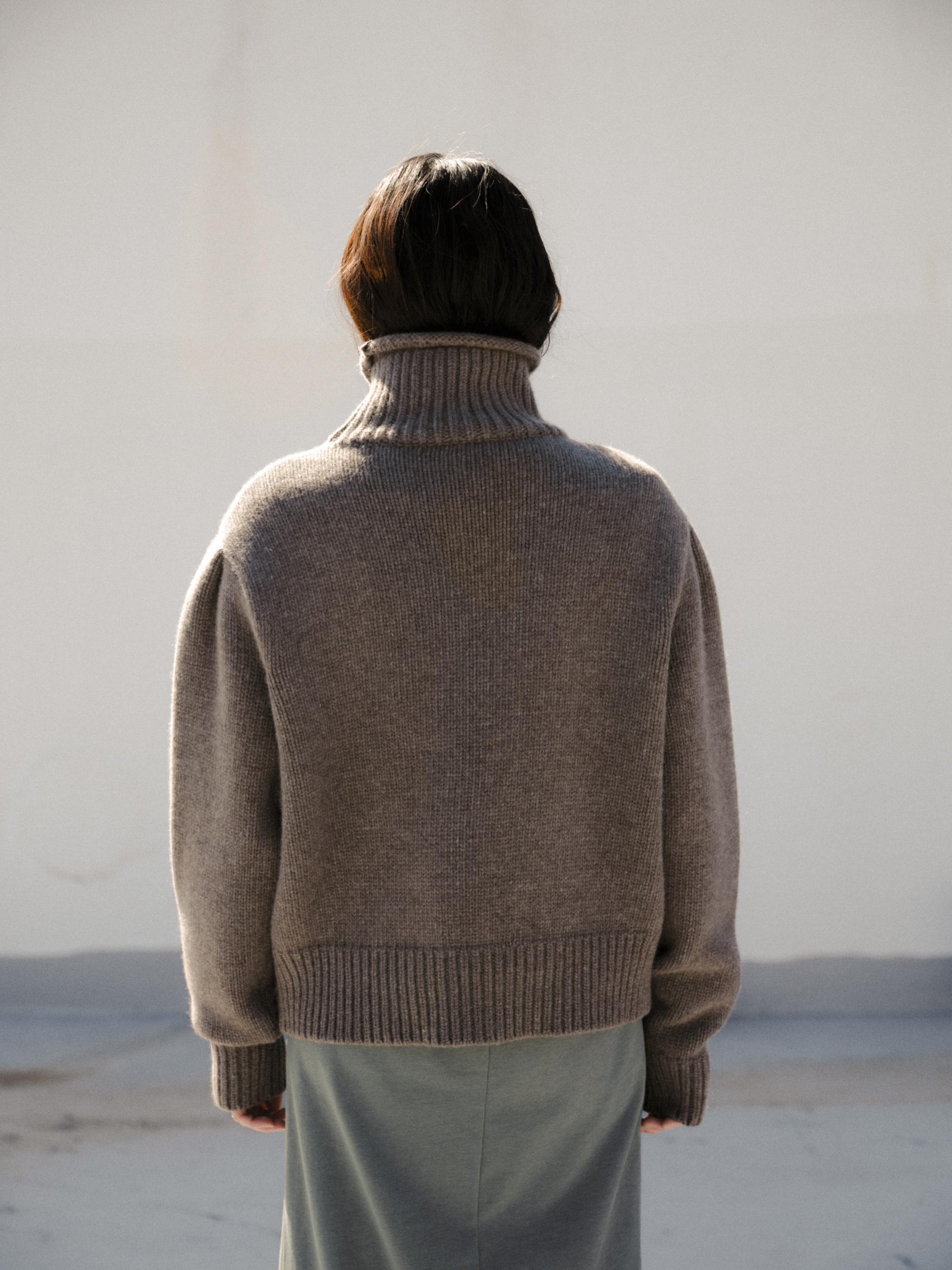 볼륨감 있는 퍼프 슬리브 실루엣의 터틀넥 스웨터입니다.